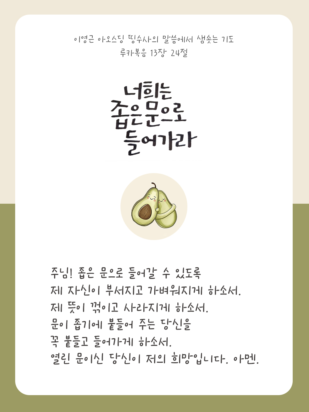 예수님께서 그들에게 이르셨다. “너희는 좁은 문으로 들어가도록 힘써라. 내가 너희에게 말한다. 많은 사람이 그곳으로 들어가려고 하겠지만 들어가지 못할 것이다. 집주인이 일어나 문을 닫아 버리면, 너희가 밖에 서서 ‘주님, 문을 열어 주십시오.’ 하며 문을 두드리기 시작하여도, 그는 ‘너희가 어디에서 온 사람들인지 나는 모른다.’ 하고 대답할 것이다. (루카 13,23-25)
