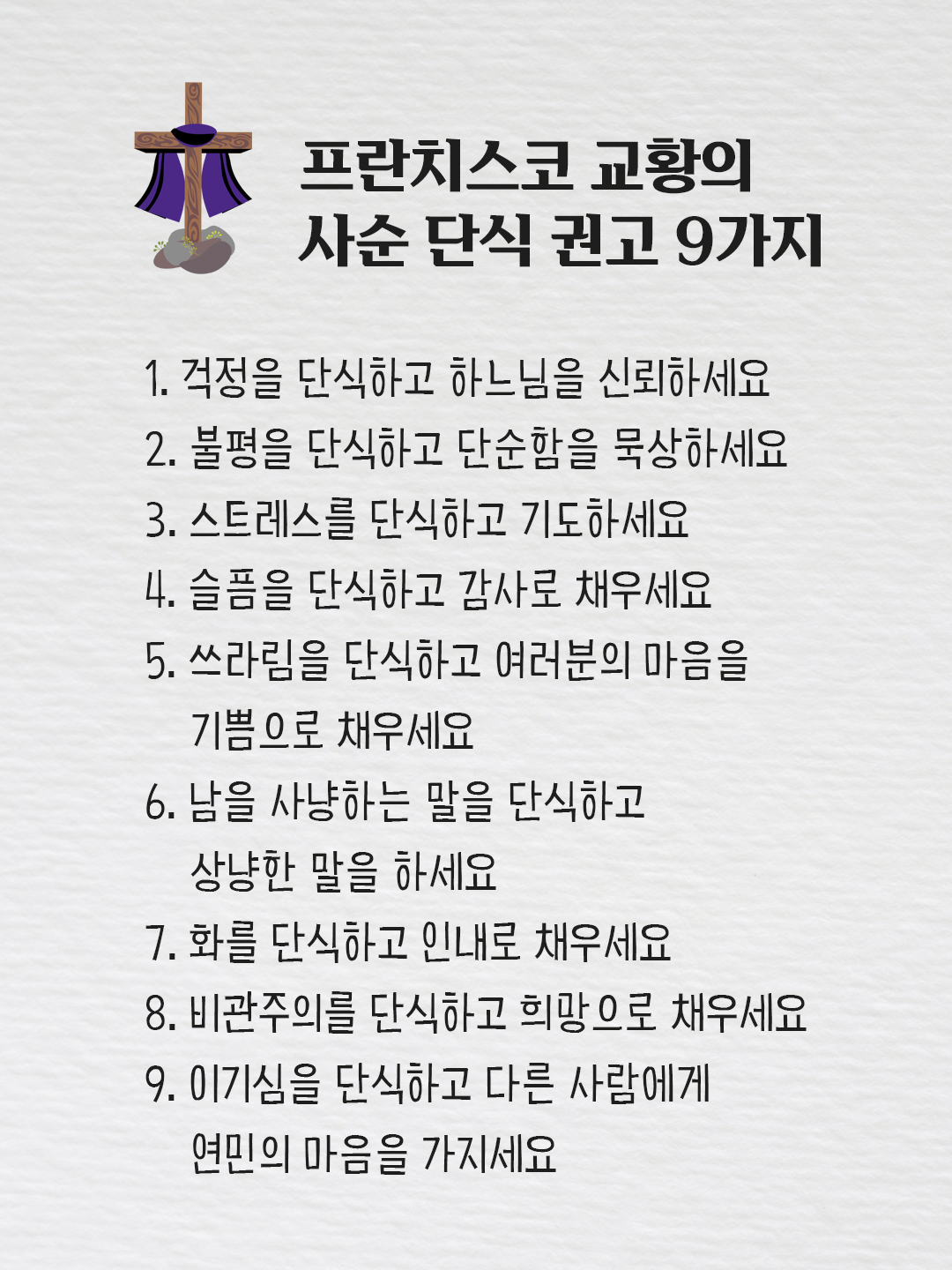 프란치스코 교황님이 제안하신 9가지 단식을 실천하며, 지금 이 순간을 더 밝고 따뜻하게 만들어 보아요.