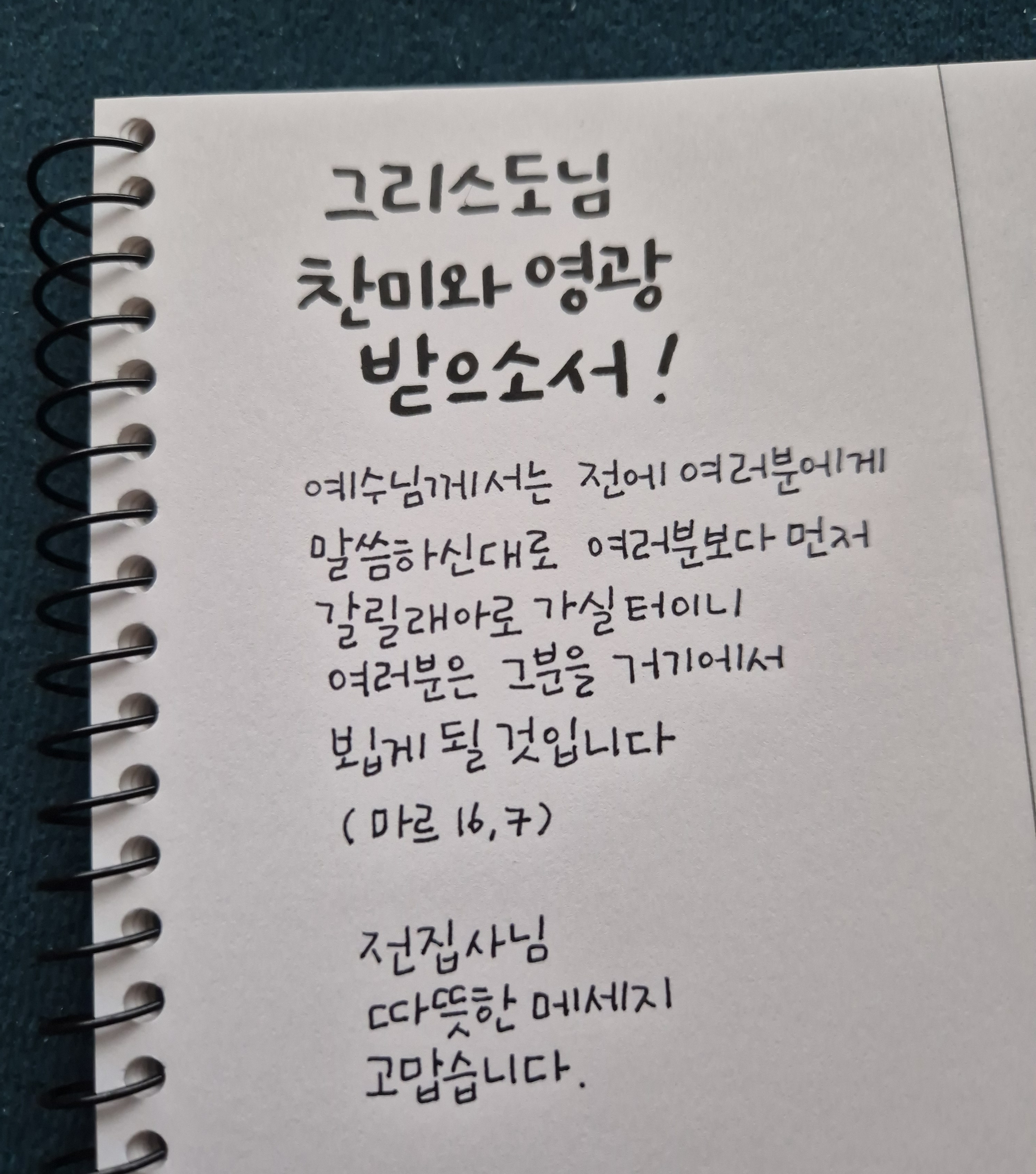 우연히 한 자매가 카톡으로 공유해 준 김영복 리카르도 신부님의 말씀 카드를 보고 캘리그라피를 독학하기로 결심했어요. 말씀 카드에 적힌 아름다운 글씨체를 본 순간 한눈에 마음을 빼앗겼습니다.