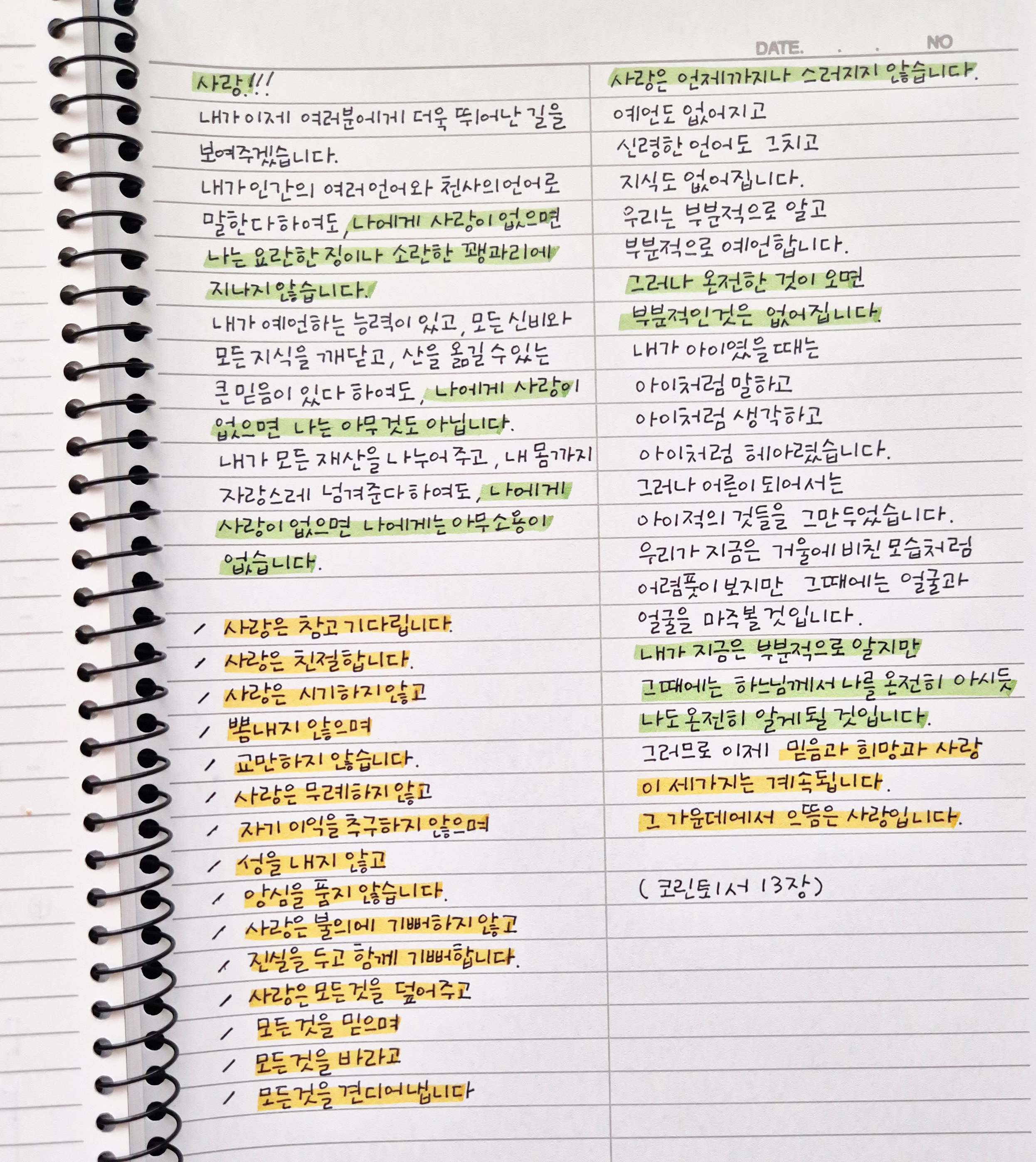 고해성사 후 신부님께서 코린토1서 13장을 보속으로 주셨어요. 말씀을 천천히 읽고 쓰다 보니 사랑이 머리에서 가슴까지 내려오는 데 칠십 년이 걸렸다는 김수환 추기경 말씀이 떠오릅니다.