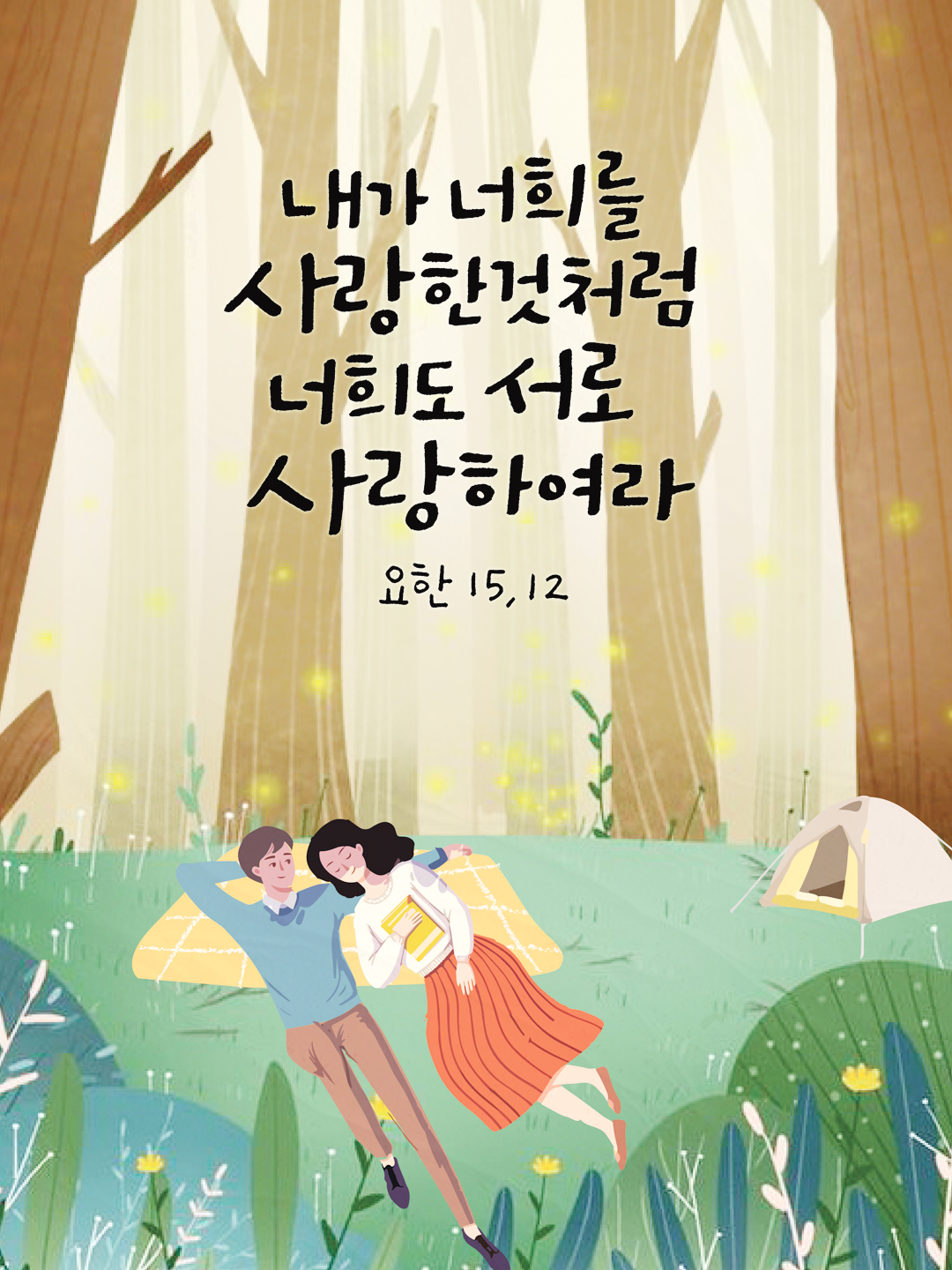 이것이 나의 계명이다. 내가 너희를 사랑한 것처럼 너희도 서로 사랑하여라. 친구들을 위하여 목숨을 내놓는 것보다 더 큰 사랑은 없다. 내가 너희에게 명령하는 것을 실천하면 너희는 나의 친구가 된다. 나는 너희를 더 이상 종이라고 부르지 않는다. 종은 주인이 하는 일을 모르기 때문이다. 나는 너희를 친구라고 불렀다. 내가 내 아버지에게서 들은 것을 너희에게 모두 알려 주었기 때문이다.