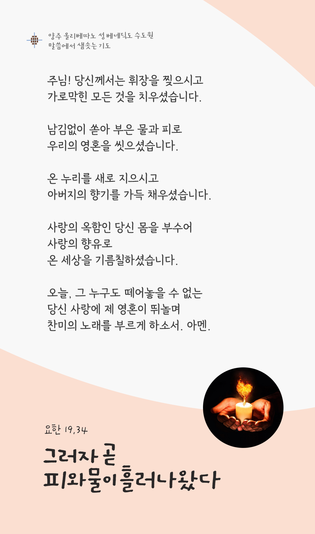 군사 하나가 창으로 그분의 옆구리를 찔렀다. 그러자 곧 피와 물이 흘러나왔다 (요한 19,34).