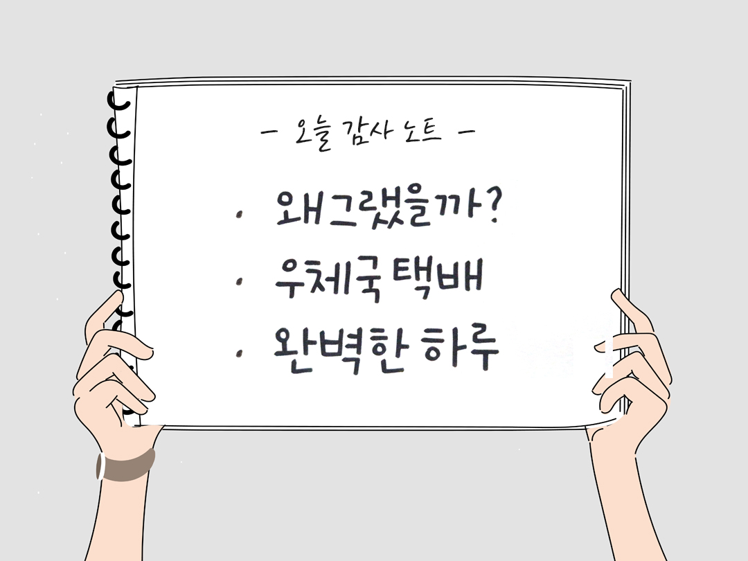 소포 보내려고 점심시간에 방문한 우체국이 대기 인원이 많지 않아 일을 빠르게 처리할 수 있음에 감사합니다. 택배 기사님들의 수고로움에 깊이 감사드립니다. - 완벽한 하루