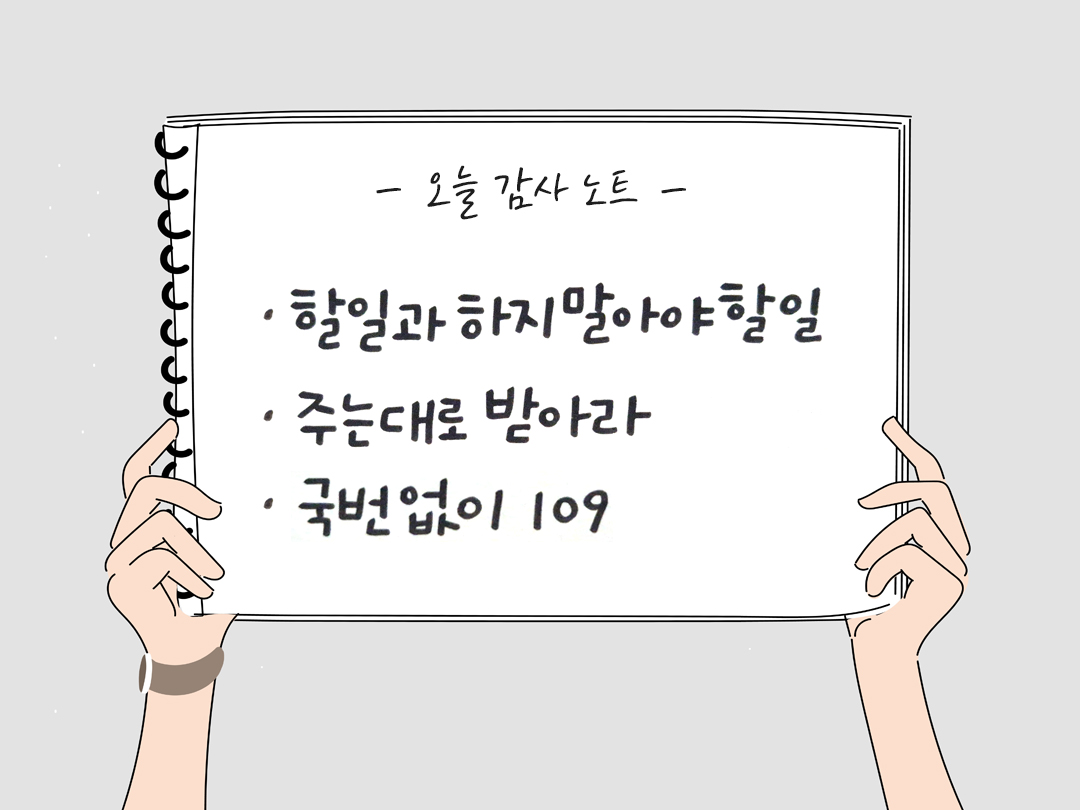 하루를 시작하며 오늘 해야 할 일과 하지 말아야 할 일을 적어보면서 지금 이 순간 여기에 집중할 수 있도록 이끌어주심에 감사합니다. - 주는 대로 받아라