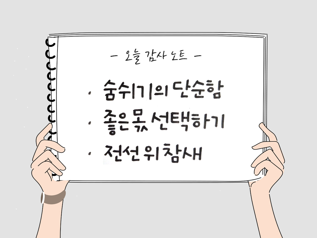 오늘은 알람이 울리기 전에 눈이 떠져서 새벽에 스트레칭을 했어요. 숨쉬기는 생명을 주고, 마음을 안정시키며, 현재에 집중할 수 있게 도와줍니다. 숨을 들이쉬고 내쉬는 단순한 이 순간의 모든 호흡에게 감사합니다. - 좋은 몫 선택하기