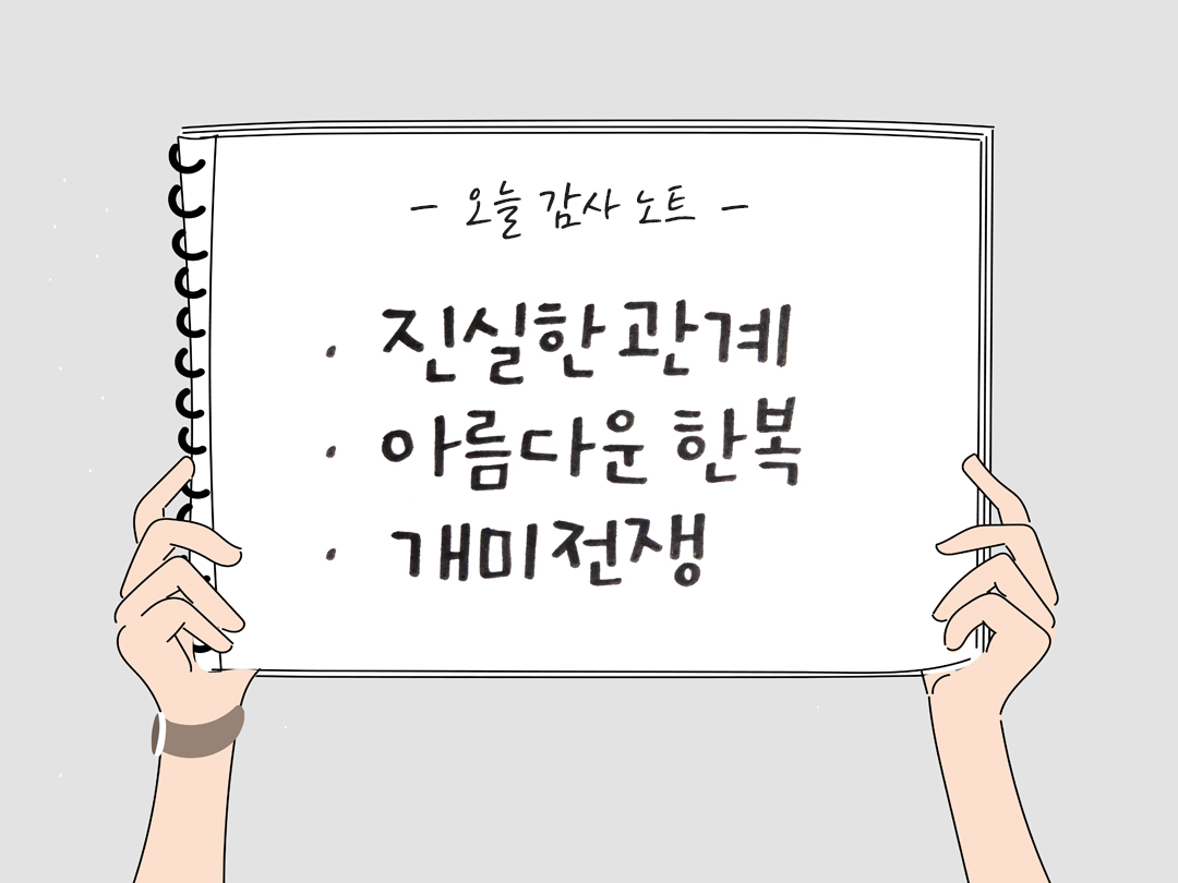 - 감사하는 순간마다 휴대폰에 메모하고 규칙적인 시간을 정해 감사노트에 옮겨 적기