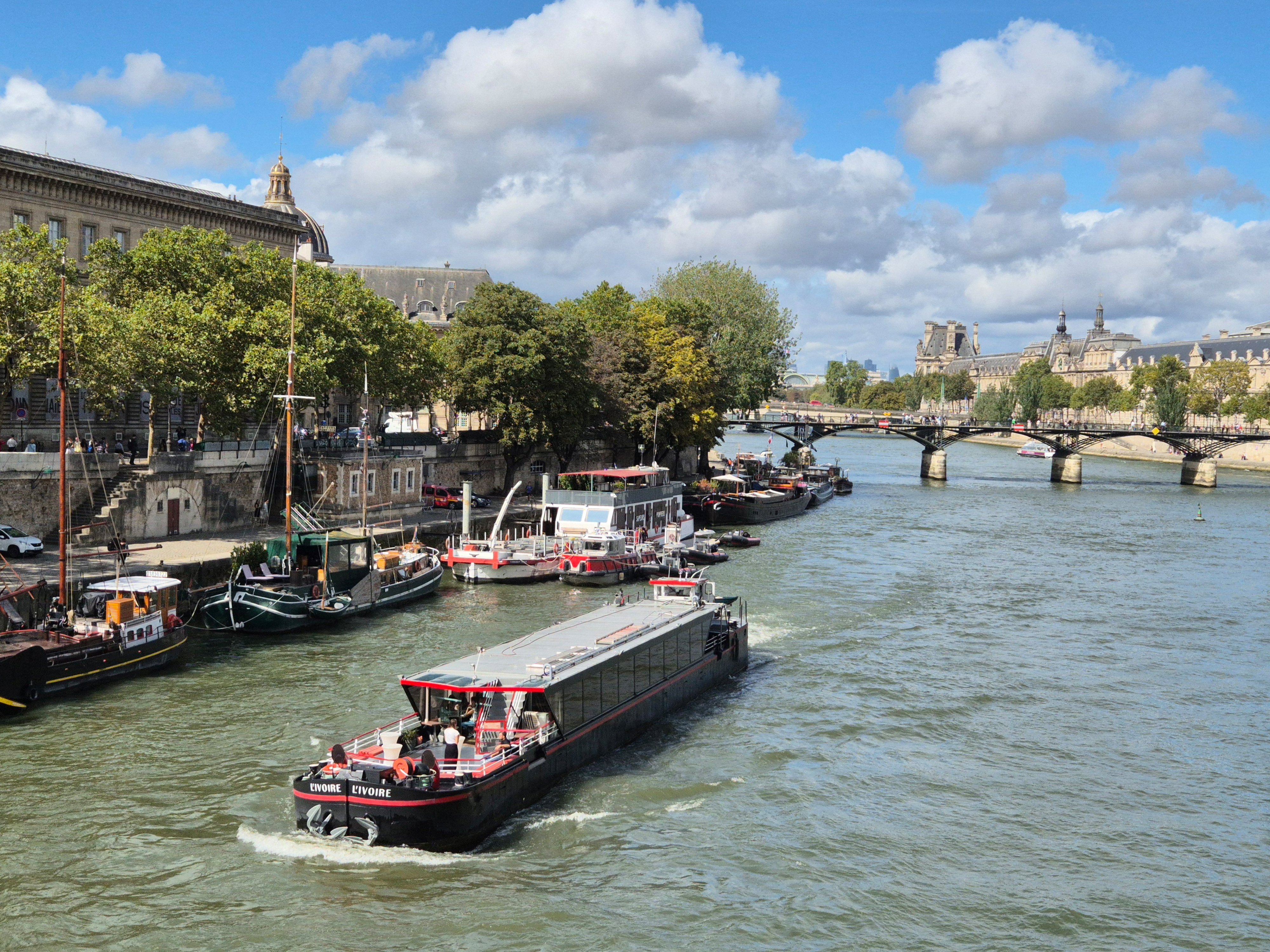 햇살에 반짝이는 센강과 함께 흘러가는 유람선 - 무료 사진 해상도