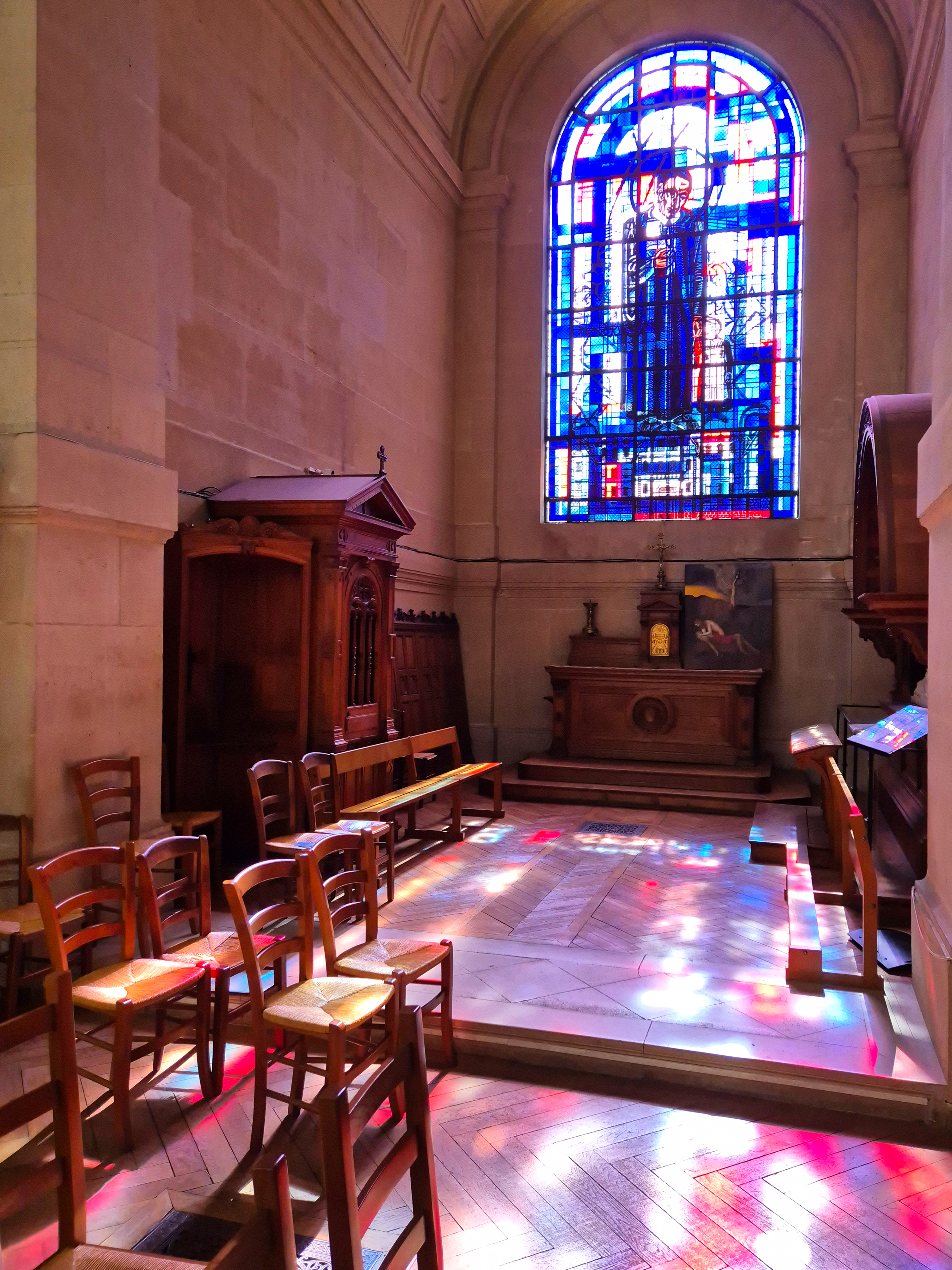 스테인드글라스를 통해 들어오는 빛이 다양한 색깔로 반짝이며 성당 안을 가득 채우고 환하게 비춥니다. 성당의 벽과 바닥에 아름다운 패턴을 만드는 빛의 살아있음에 감사합니다. - 양파스프 한 그릇