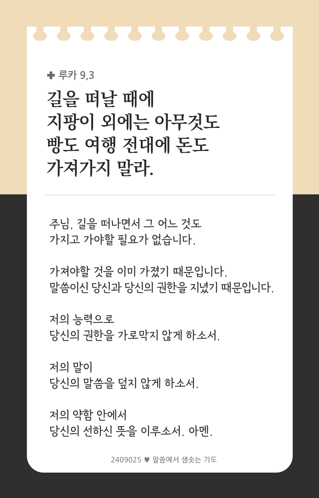 길을 떠날 때에 지팡이 외에는 아무것도 빵도 여행 전대에 돈도 가져가지 말라. (루카 9,3)