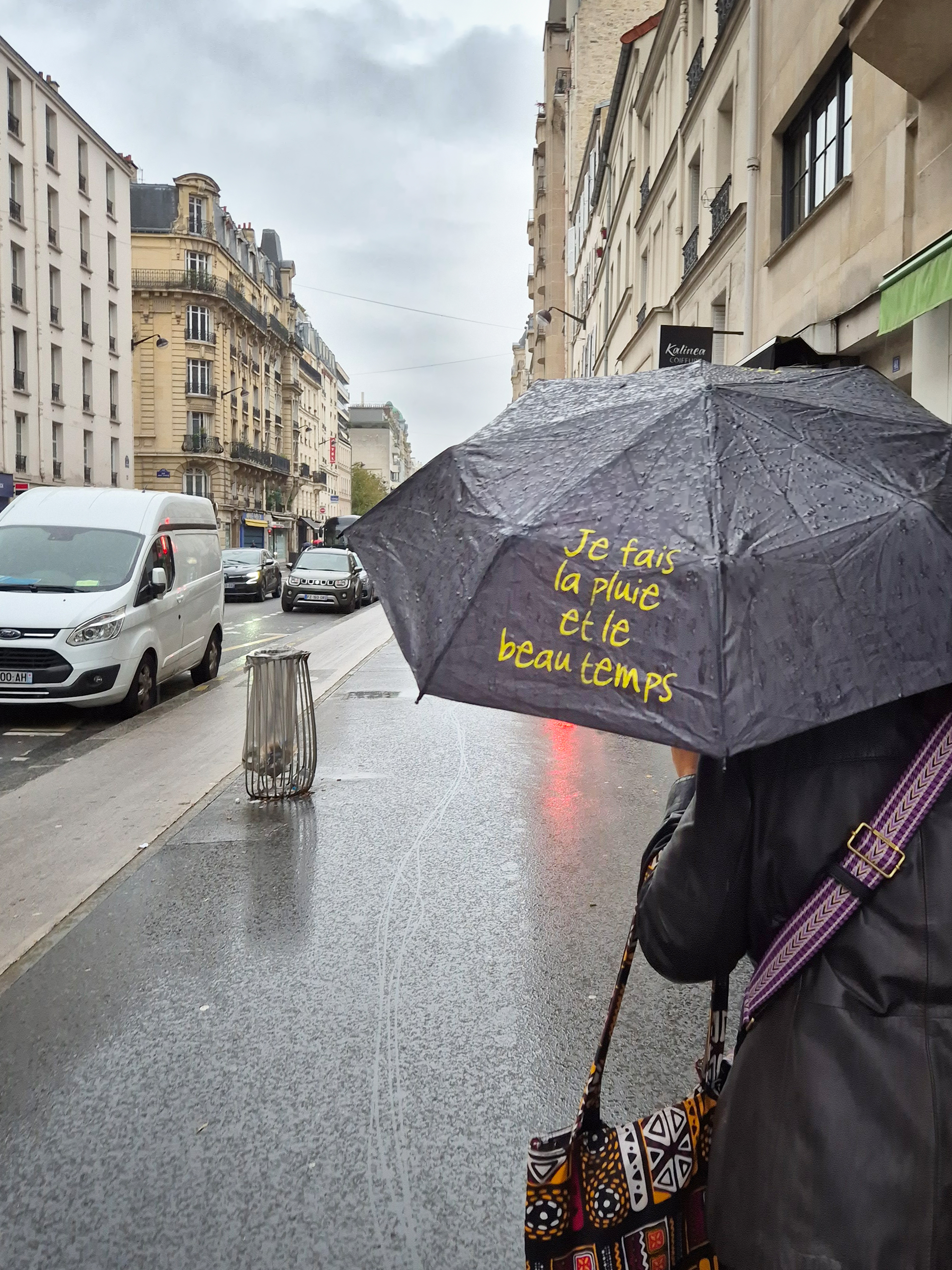 앞에 걸어가시는 분의 우산에 적힌 글귀를 보고 하루를 기쁘게 시작했어요. 나는 비도 만들고 좋은 날씨도 만든다는 우산에게 감사합니다. 아버지, 당신 뜻대로 하소서. 아멘.