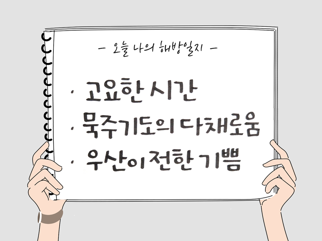 바다가 하늘을 있는 그대로 반사하듯 우리의 하루도 기쁘거나, 빛나거나, 고통스럽거나, 영광스러운 색을 담을 수 있도록 이끌어주심에 감사합니다. 묵주기도의 다채로운 반복을 통하여 오늘을 더 견고하게 만들어주심에 감사합니다. - 우산이 전한 기쁨