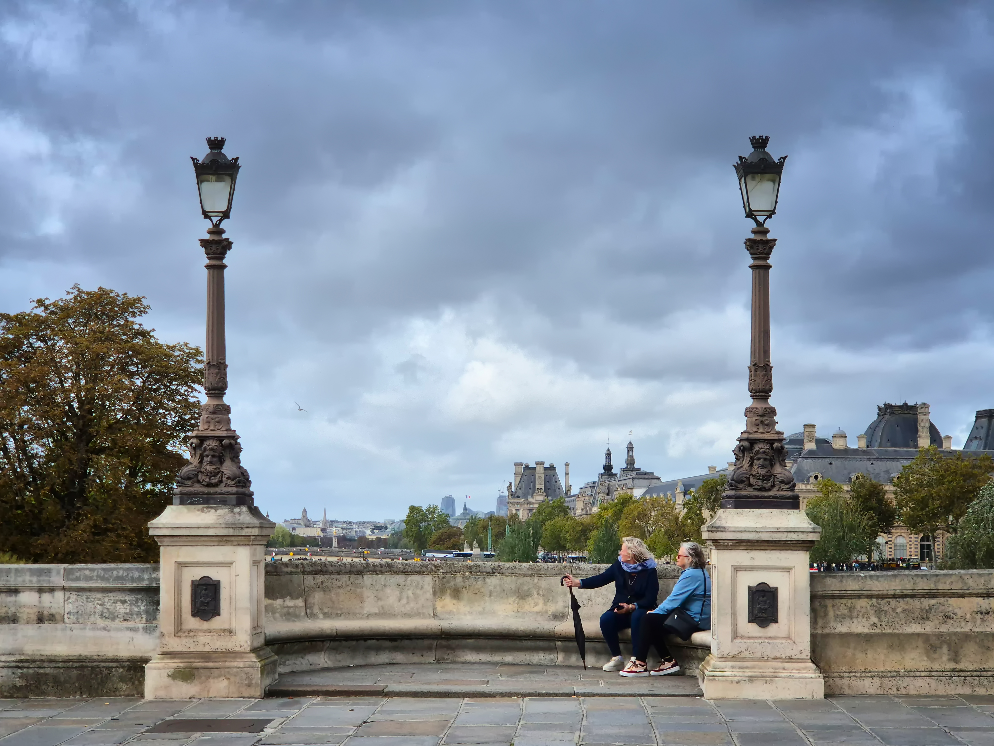 분주한 여행사 단체에서 잠시 빠져나와 의자에 앉아 센강을 바라보며 쉬고 있는 어머니들. 노세 노세 젊어서 노세! - 무료 사진 해상도