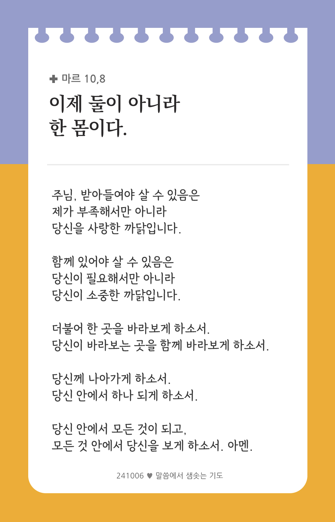 이제 둘이 아니라 한 몸이다. (마르 10,8)
