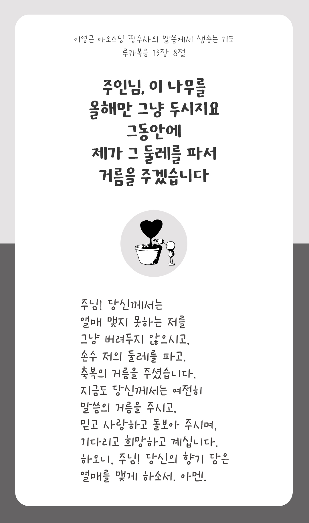 어떤 사람이 자기 포도밭에 무화과나무 한 그루를 심어 놓았다. 그리고 나중에 가서 그 나무에 열매가 달렸나 하고 찾아보았지만 하나도 찾지 못하였다. 그래서 포도 재배인에게 일렀다. ‘보게, 내가 삼 년째 와서 이 무화과나무에 열매가 달렸나 하고 찾아보지만 하나도 찾지 못하네. 그러니 이것을 잘라 버리게. 땅만 버릴 이유가 없지 않은가?’ 그러자 포도 재배인이 그에게 대답하였다. ‘주인님, 이 나무를 올해만 그냥 두시지요. 그동안에 제가 그 둘레를 파서 거름을 주겠습니다. 그러면 내년에는 열매를 맺겠지요. 그러지 않으면 잘라 버리십시오.’ (루카 13,6-9)