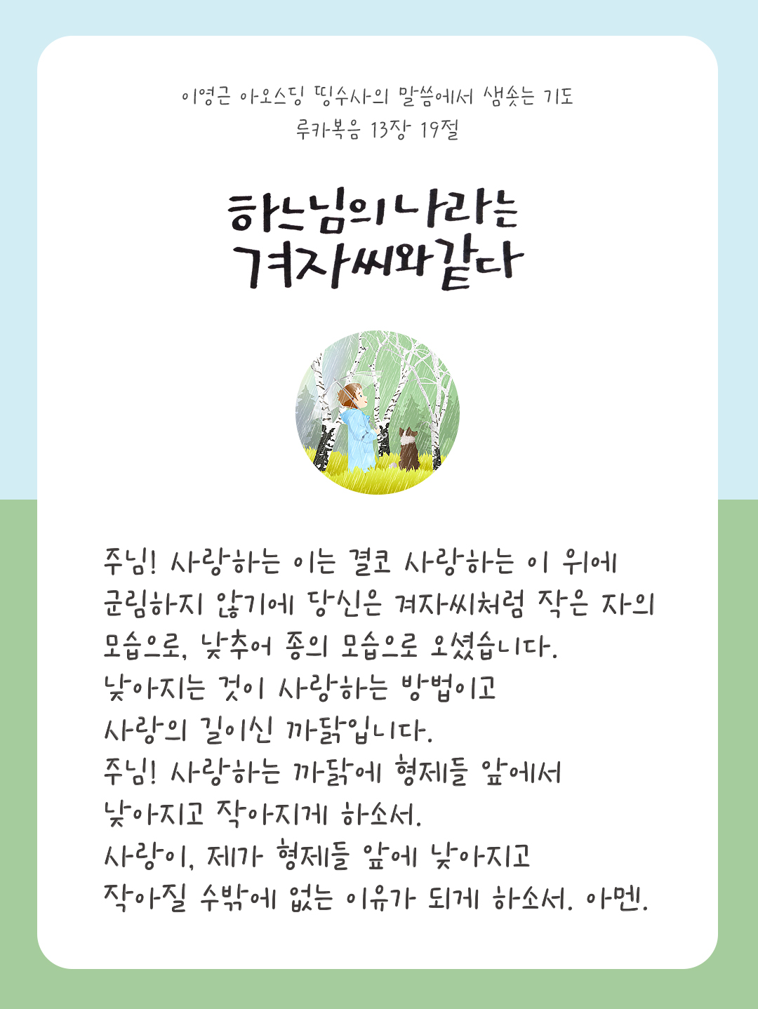 “하느님의 나라는 무엇과 같을까? 그것을 무엇에 비길까? 하느님의 나라는 겨자씨와 같다. 어떤 사람이 그것을 가져다가 자기 정원에 심었다. 그랬더니 자라서 나무가 되어 하늘의 새들이 그 가지에 깃들였다.” (루카 13,18-19)