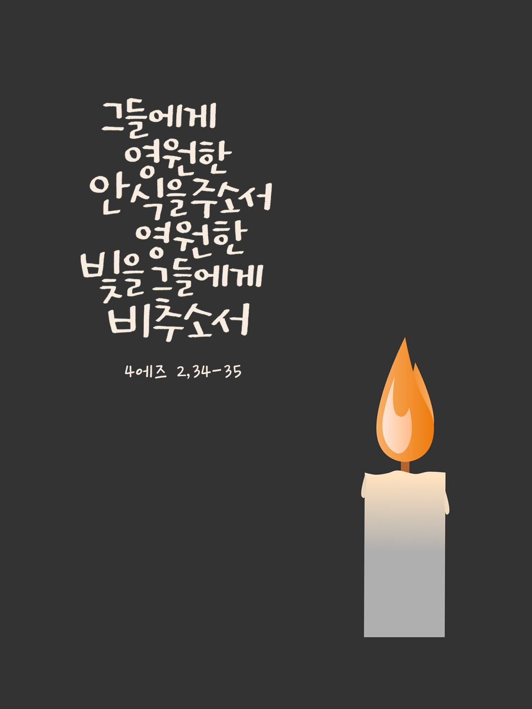 주님, 그들에게 영원한 안식을 주소서. 영원한 빛을 그들에게 비추소서. 세상을 떠난 모든 이가 하느님의 자비로 평화의 안식을 얻게 하소서. (영원한 안식을 위한 기도)