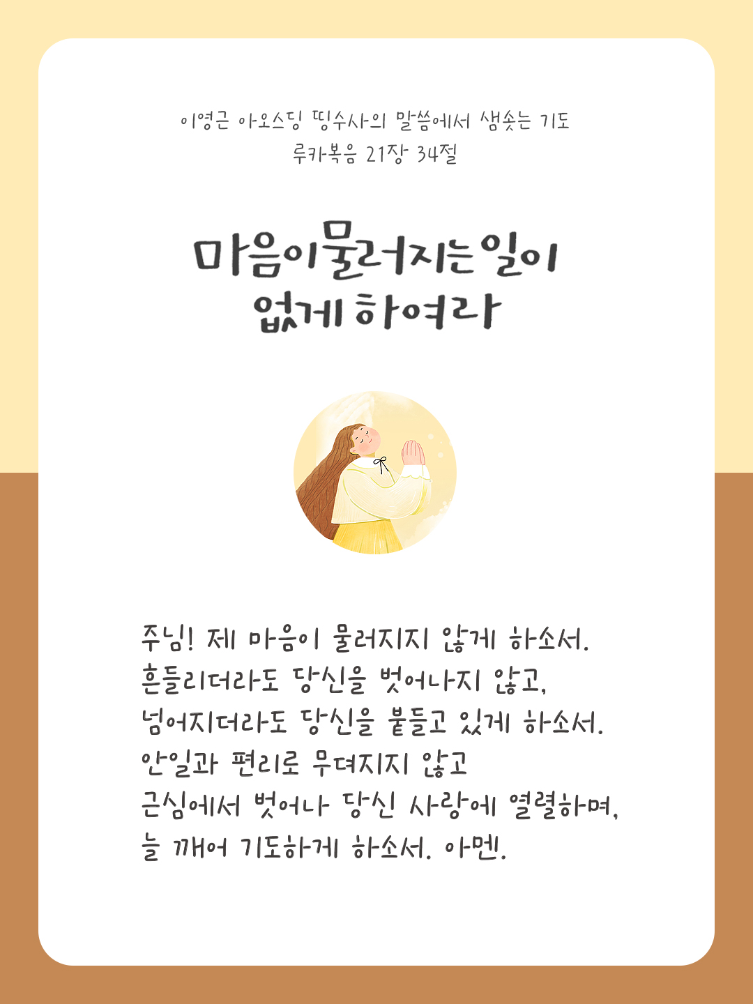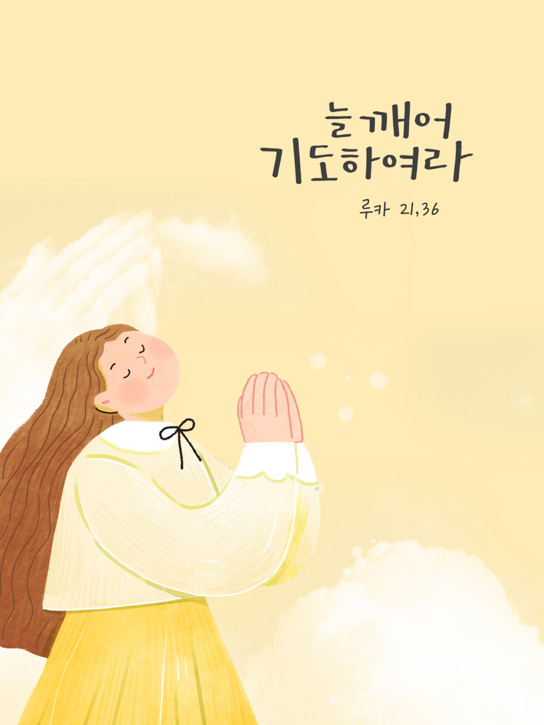 너희는 스스로 조심하여, 방탕과 만취와 일상의 근심으로 너희 마음이 물러지는 일이 없게 하여라. 그리고 그날이 너희를 덫처럼 갑자기 덮치지 않게 하여라. 그날은 온 땅 위에 사는 모든 사람에게 들이닥칠 것이다. 너희는 앞으로 일어날 이 모든 일에서 벗어나 사람의 아들 앞에 설 수 있는 힘을 지니도록 늘 깨어 기도하여라. (루카 21,34-36)