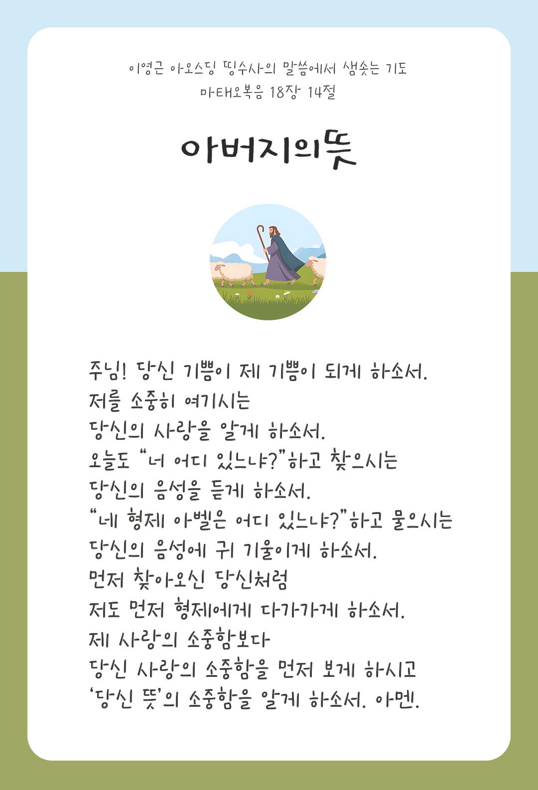 그가 양을 찾게 되면, 내가 진실로 너희에게 말하는데, 길을 잃지 않은 아흔아홉 마리보다 그 한 마리를 두고 더 기뻐한다. 이와 같이 이 작은 이들 가운데 하나라도 잃어버리는 것은 하늘에 계신 너희 아버지의 뜻이 아니다. (마태 18,13-14)