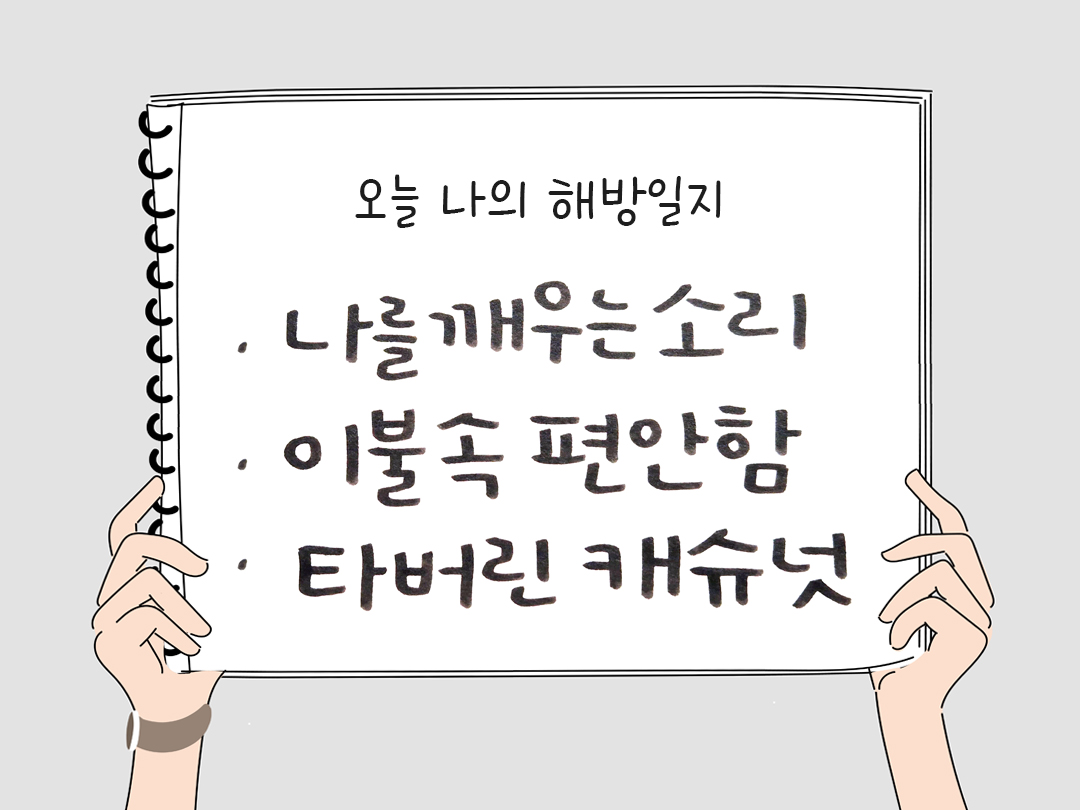 늦잠자고 하루를 편안하게 시작했어요. 몸과 마음을 천천히 깨우며 늦잠 자도록 도와준 포근한 이불에게 감사합니다. - 홀라당 타버린 캐슈넛