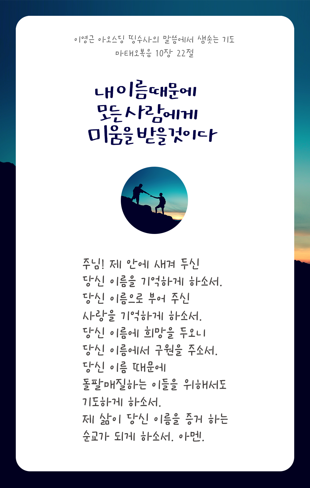 너희는 내 이름 때문에 모든 사람에게 미움을 받을 것이다. 그러나 끝까지 견디는 이는 구원을 받을 것이다. (마태 10,22)