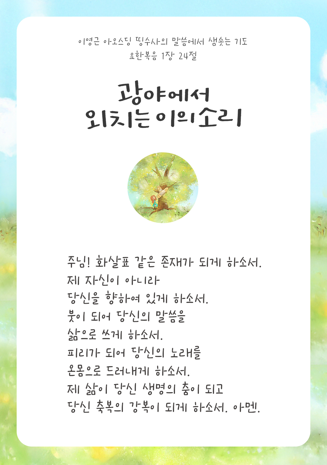 나는 이사야 예언자가 말한 대로 ‘너희는 주님의 길을 곧게 내어라.’ 하고 광야에서 외치는 이의 소리다. (요한 1,23)