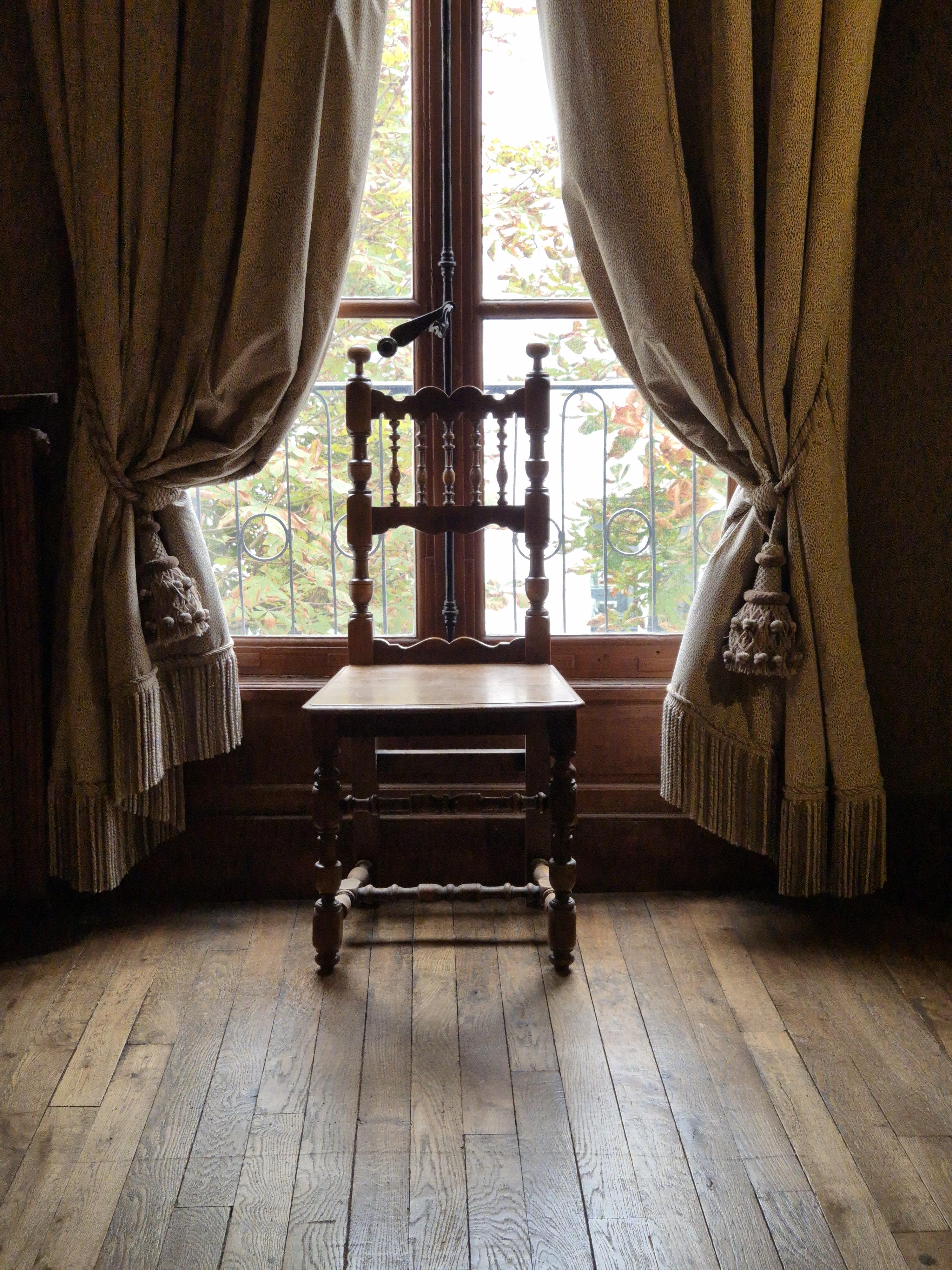 파리 마레지구 빅토르 위고의 집 커튼과 의자 사이로 보이는 창문 이미지 - 무료 사진 해상도