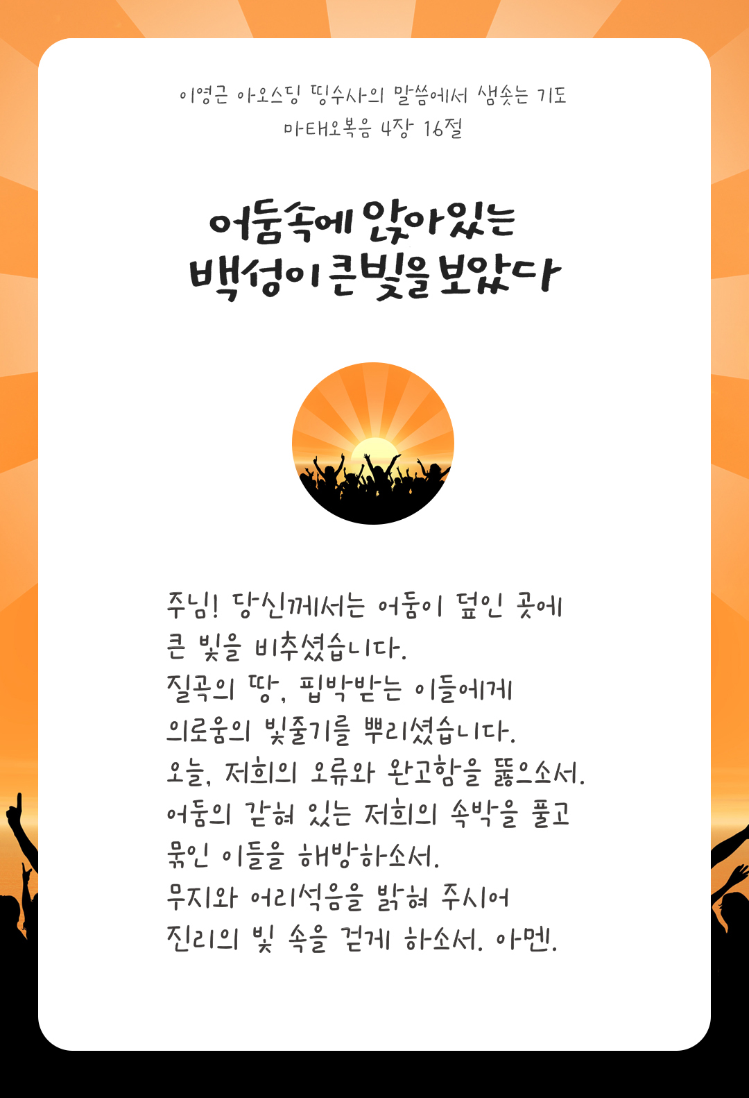 어둠 속에 앉아 있는 백성이 큰 빛을 보았다. 죽음의 그림자가 드리운 고장에 앉아 있는 이들에게 빛이 떠올랐다. (마태 4,16)