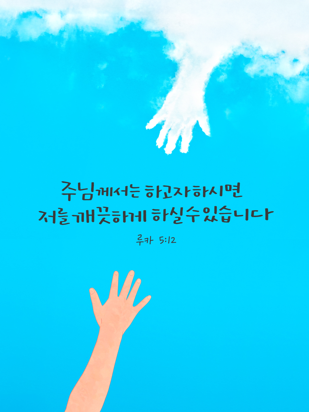 예수님께서 어느 한 고을에 계실 때, 온몸에 나병이 걸린 사람이 다가왔다. 그는 예수님을 보자 얼굴을 땅에 대고 엎드려 이렇게 청하였다. “주님! 주님께서는 하고자 하시면 저를 깨끗하게 하실 수 있습니다.” 예수님께서 손을 내밀어 그에게 대시며 말씀하셨다. “내가 하고자 하니 깨끗하게 되어라.” 그러자 곧 나병이 가셨다. (루카 5,12-13)