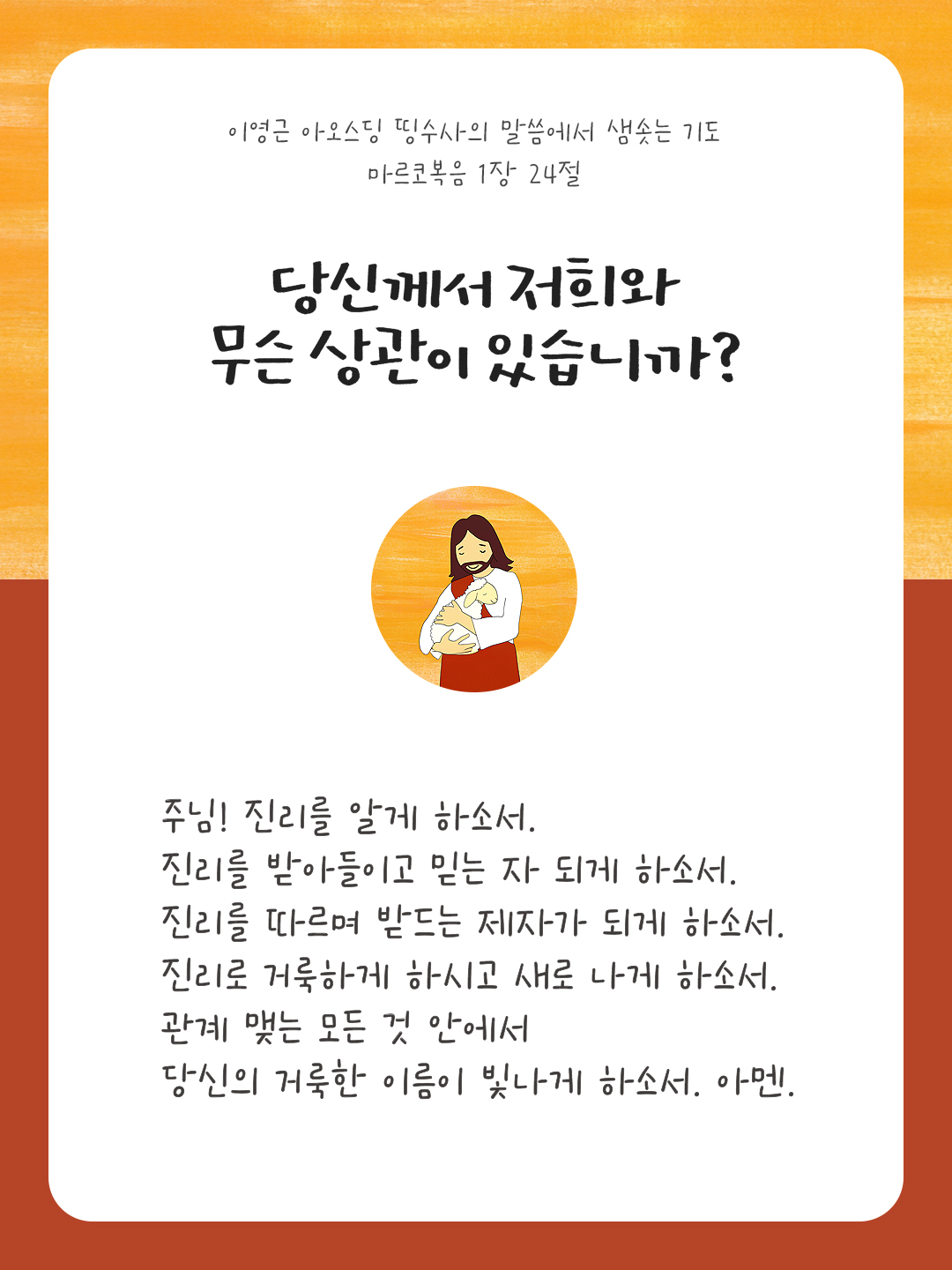 친구의 이야기를 듣다 보니 저와는 조금 다른 세상에 속해 있는 것 같아서 친구가 낯설게 느껴졌어요. 날마다 주어지는 한 말씀을 통하여 지혜로운 삶으로 초대해 주심에 감사합니다. 주님, 제게 당신의 길을 가르치소서. 제가 당신의 진실 안에 걸으오리다. 당신 이름을 경외하도록 제 마음을 모아 주소서. 아멘.