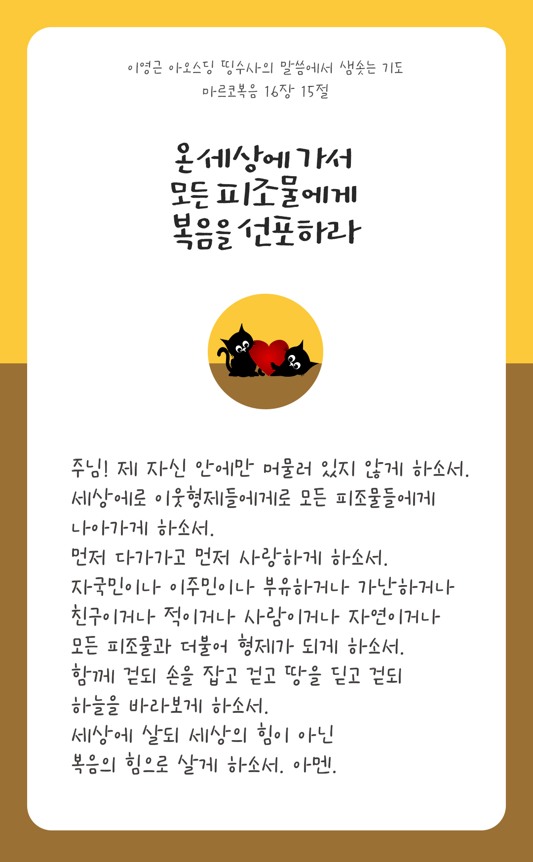 온 세상에 가서 모든 피조물에게 복음을 선포하라. (마르 16,15)