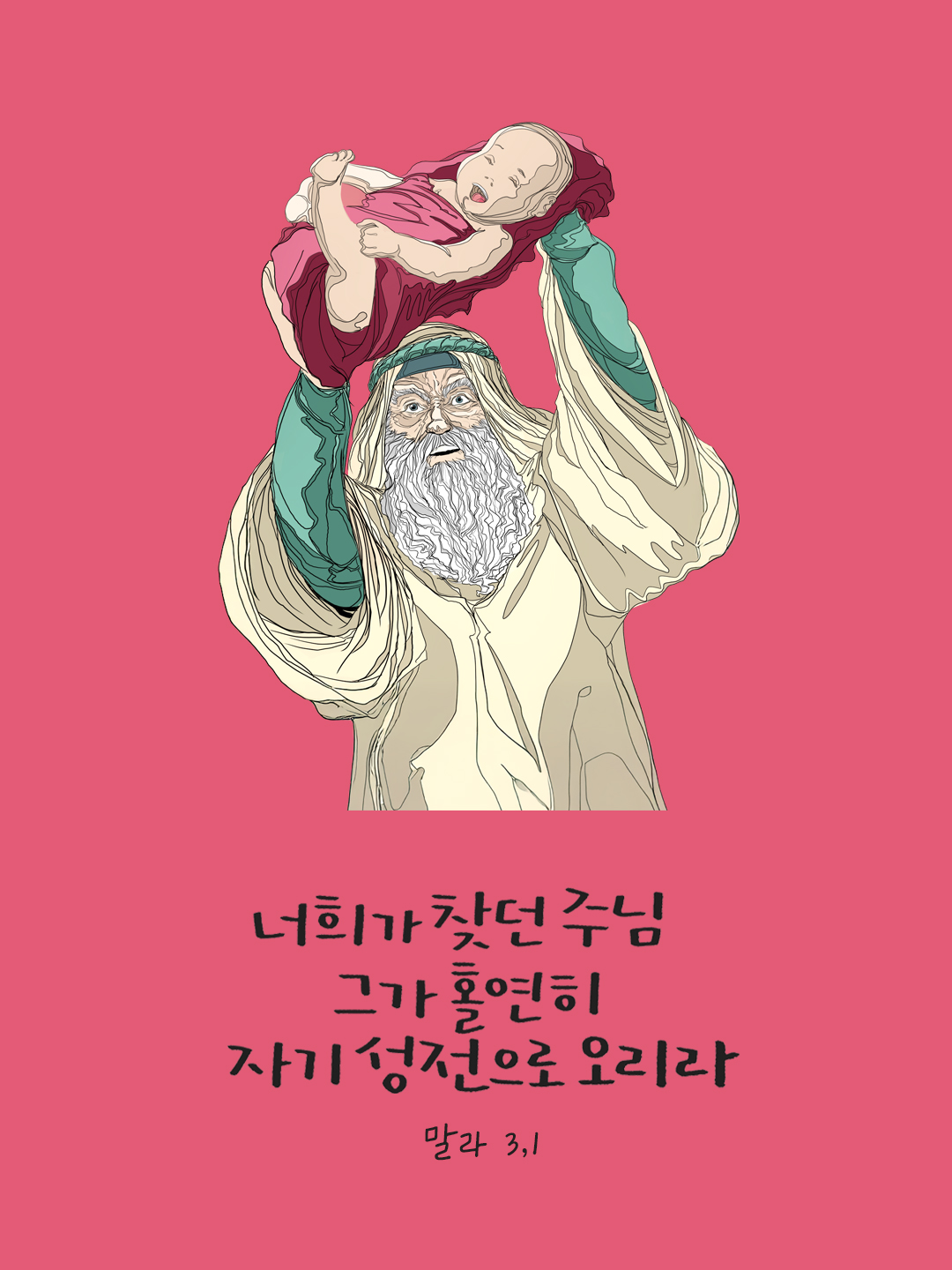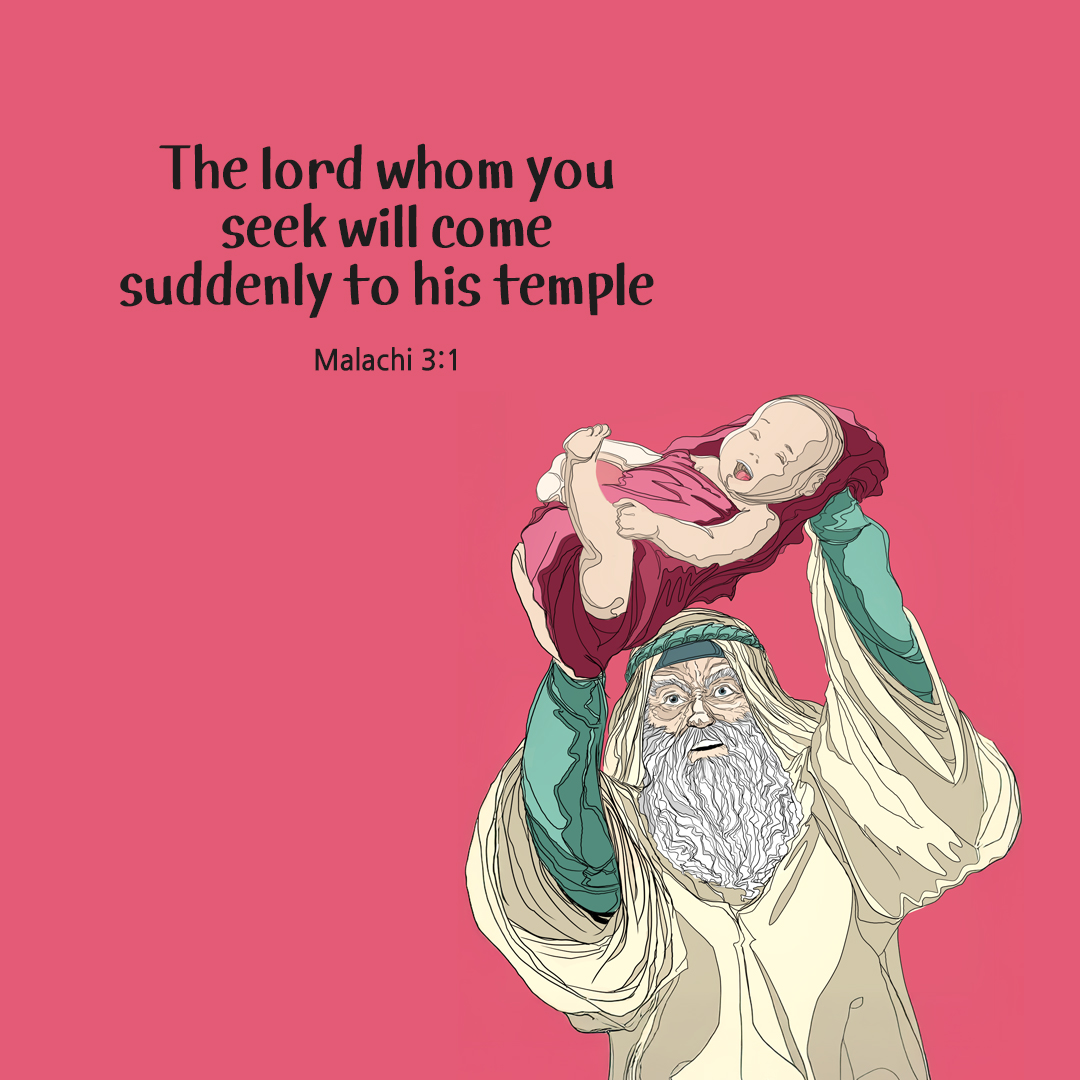 그가 성령에 이끌려 성전으로 들어갔다. 그리고 아기에 관한 율법의 관례를 준수하려고 부모가 아기 예수님을 데리고 들어오자, 그는 아기를 두 팔에 받아 안고 이렇게 하느님을 찬미하였다. “주님, 이제야 말씀하신 대로 당신 종을 평화로이 떠나게 해 주셨습니다. 제 눈이 당신의 구원을 본 것입니다. 이는 당신께서 모든 민족들 앞에서 마련하신 것으로 다른 민족들에게는 계시의 빛이며 당신 백성 이스라엘에게는 영광입니다.” (루카 2,27-32)