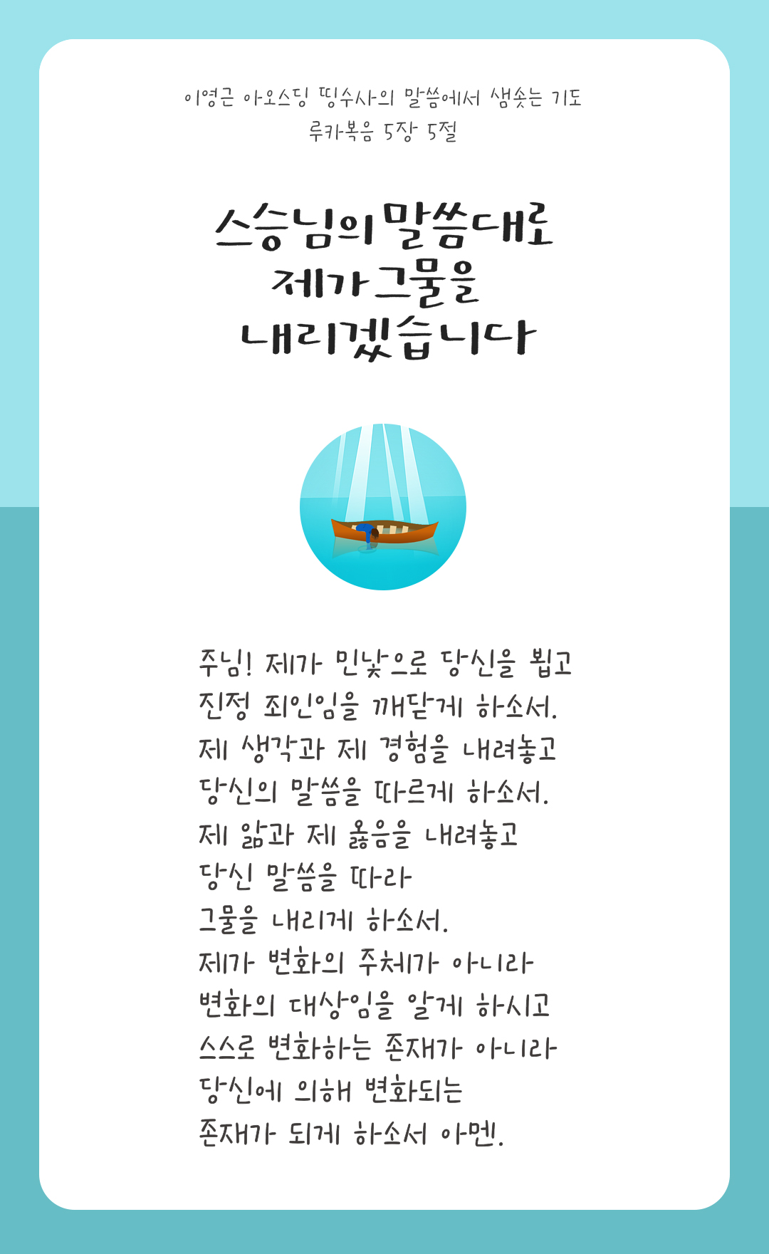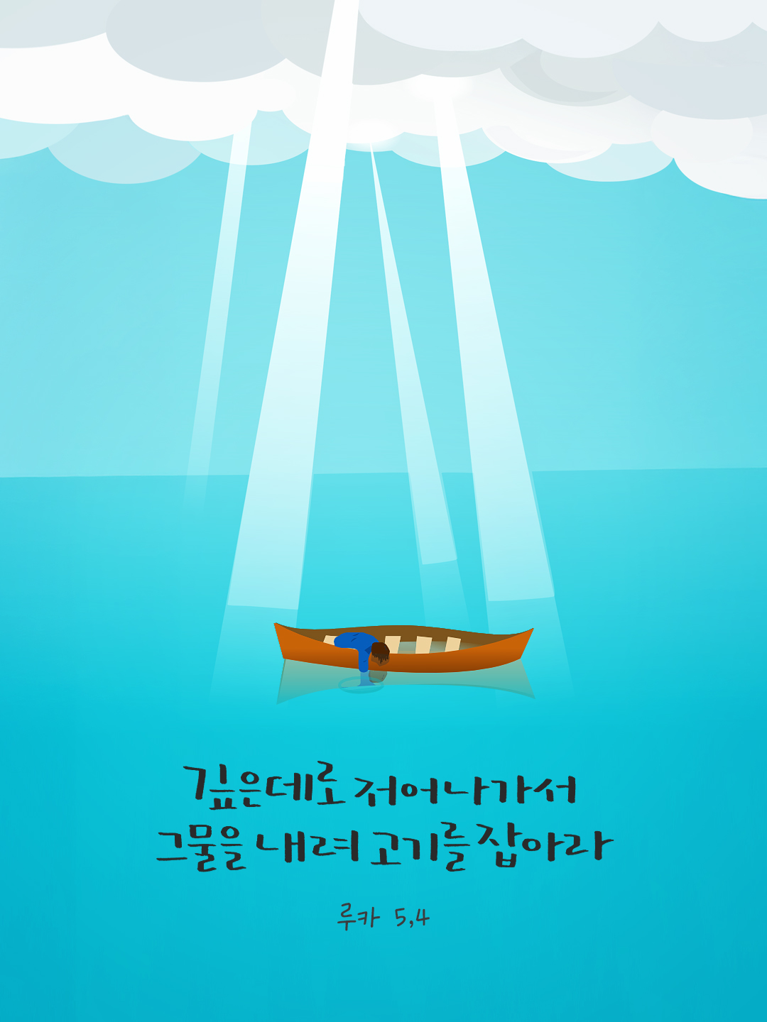 예수님께서 말씀을 마치시고 나서 시몬에게 이르셨다. “깊은 데로 저어 나가서 그물을 내려 고기를 잡아라.” 시몬이 “스승님, 저희가 밤새도록 애썼지만 한 마리도 잡지 못하였습니다. 그러나 스승님의 말씀대로 제가 그물을 내리겠습니다.” 하고 대답하였다. 그렇게 하자 그들은 그물이 찢어질 만큼 매우 많은 물고기를 잡게 되었다. (루카 5,4-6)