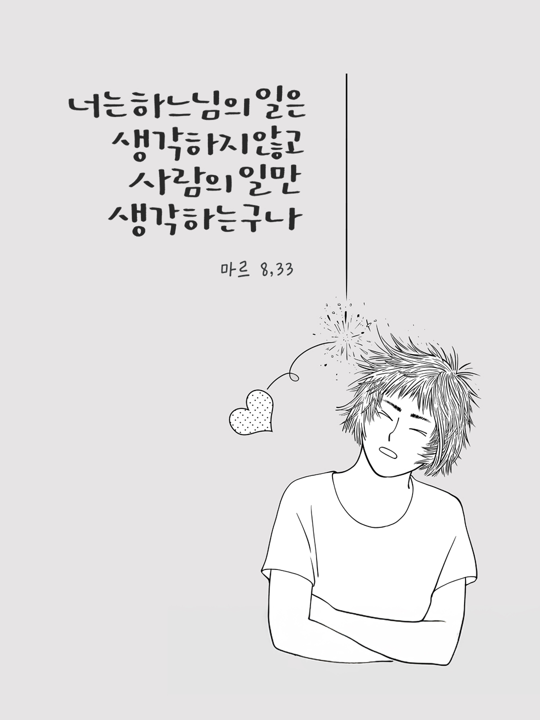 예수님께서는 이 말씀을 명백히 하셨다. 그러자 베드로가 예수님을 꼭 붙들고 반박하기 시작하였다. 그러나 예수님께서는 돌아서서 제자들을 보신 다음 베드로에게, “사탄아, 내게서 물러가라. 너는 하느님의 일은 생각하지 않고 사람의 일만 생각하는구나.” 하며 꾸짖으셨다. (마르 8,32-33)