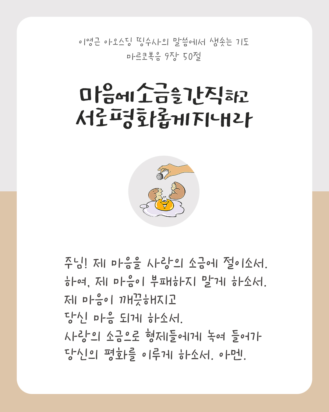 너희는 마음에 소금을 간직하고 서로 평화롭게 지내라. (마르 9,50)