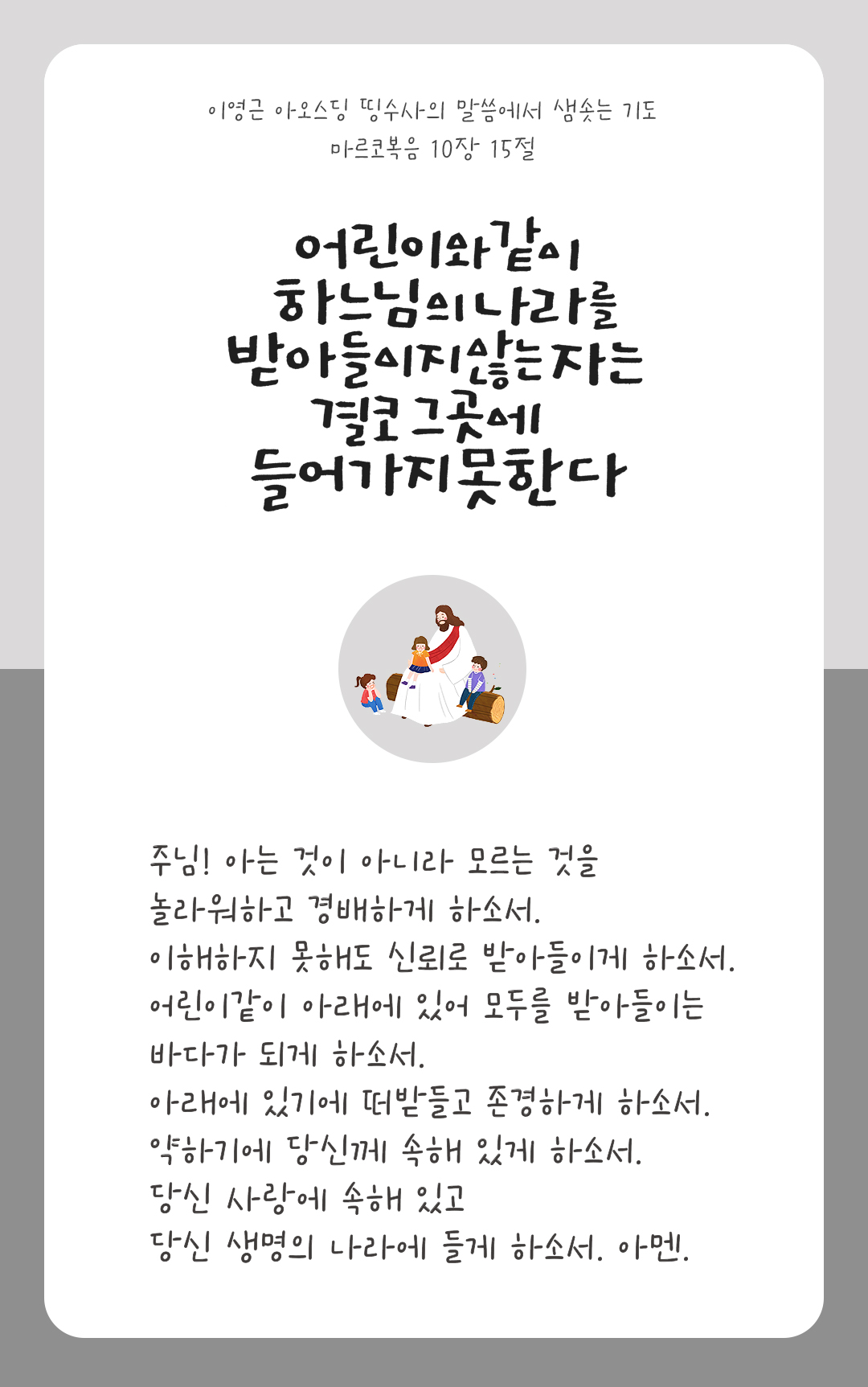 어린이들이 나에게 오는 것을 막지 말고 그냥 놓아두어라. 사실 하느님의 나라는 이 어린이들과 같은 사람들의 것이다. 내가 진실로 너희에게 말한다. 어린이와 같이 하느님의 나라를 받아들이지 않는 자는 결코 그곳에 들어가지 못한다.” 그러고 나서 어린이들을 끌어안으시고 그들에게 손을 얹어 축복해 주셨다. (마르 10,14-16)