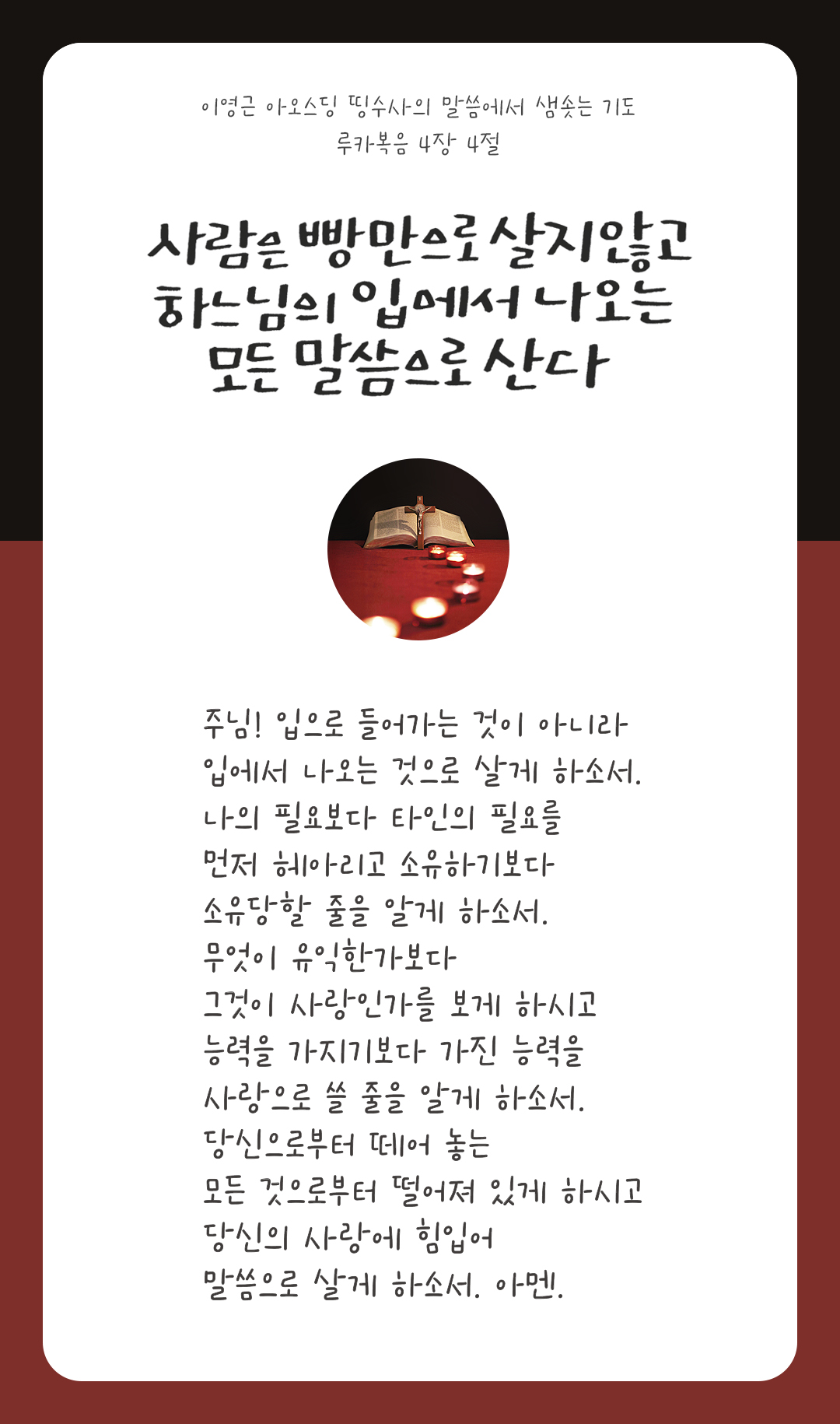 사람은 빵만으로 살지 않고 하느님의 입에서 나오는 모든 말씀으로 산다. (루카 4,4)