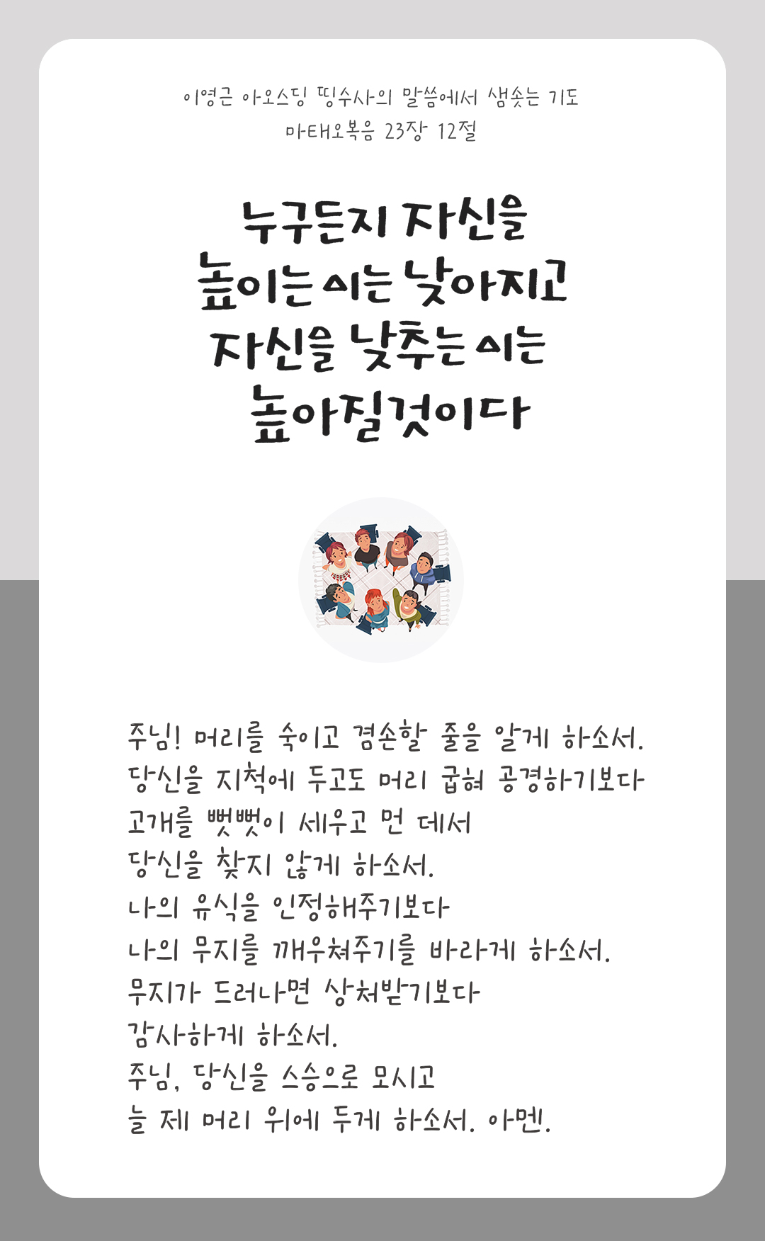 누구든지 자신을 높이는 이는 낮아지고 자신을 낮추는 이는 높아질 것이다. (마태 23,12)