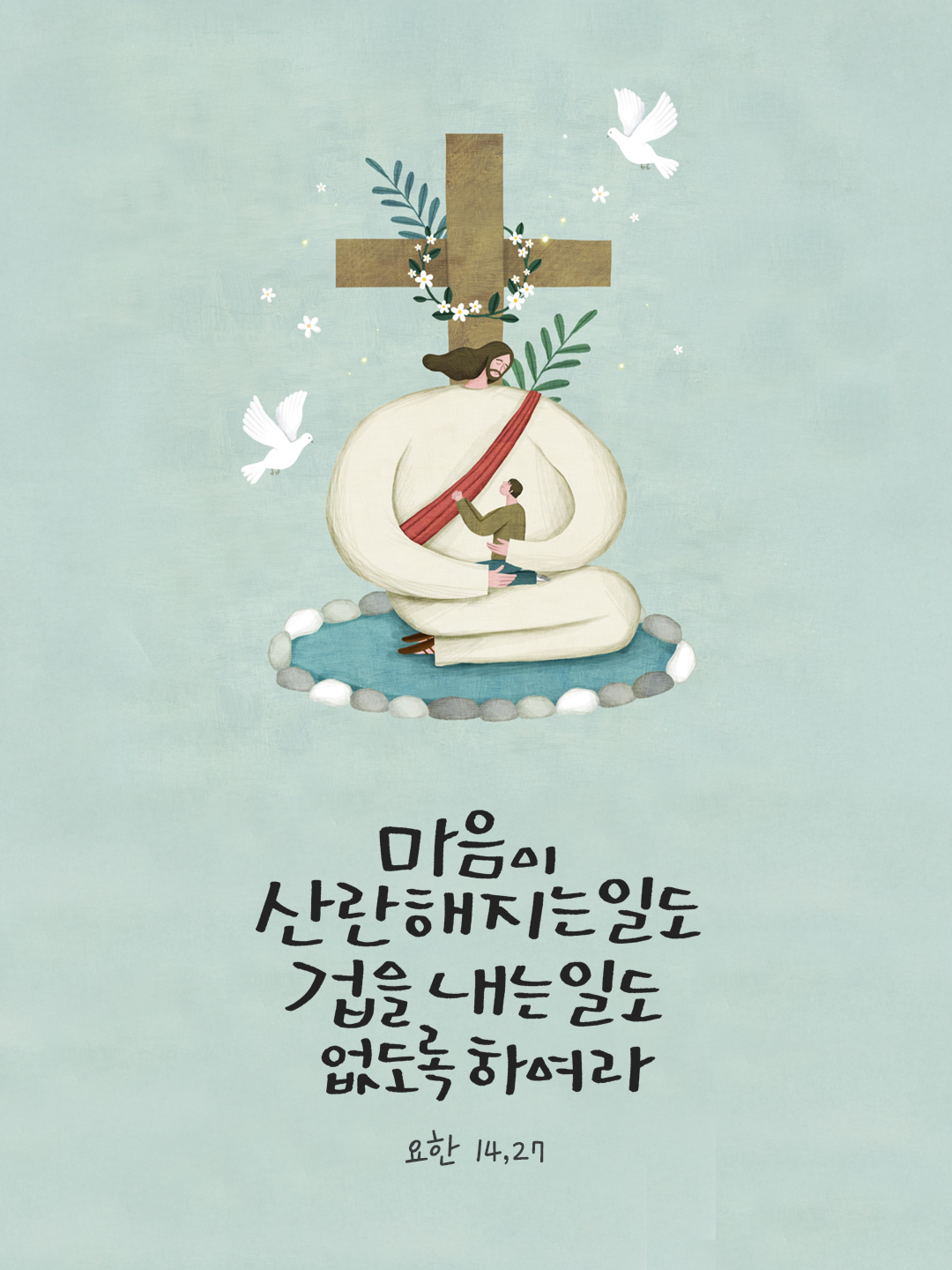 보호자, 곧 아버지께서 내 이름으로 보내실 성령께서 너희에게 모든 것을 가르치시고 내가 너희에게 말한 모든 것을 기억하게 해 주실 것이다. 나는 너희에게 평화를 남기고 간다. 내 평화를 너희에게 준다. 내가 주는 평화는 세상이 주는 평화와 같지 않다. 너희 마음이 산란해지는 일도, 겁을 내는 일도 없도록 하여라. (요한 14,26-27)