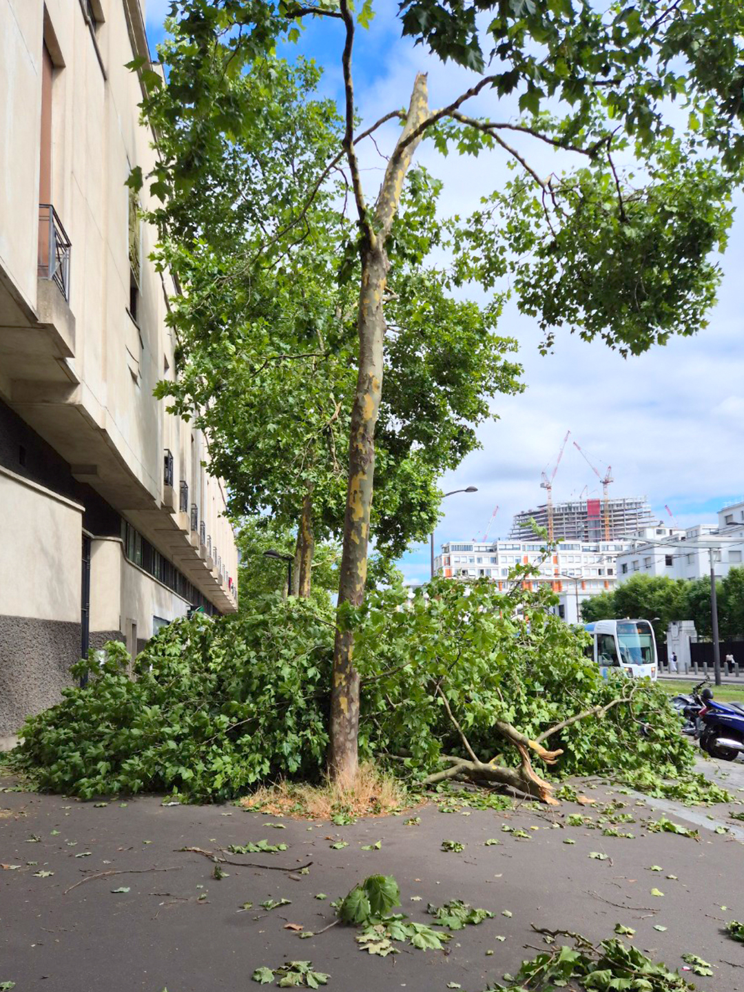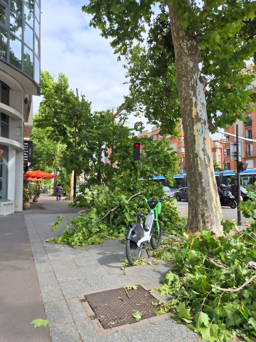 밤에 천둥과 번개를 동반한 비가 쏟아졌어요. 그리고 오늘, 어제보다 기온이 15도나 뚝 떨어졌습니다. 파리의 여름은 때로 덥지만, 습기가 없어 그늘에만 들어가도 시원해요. 특히 비가 지나간 터라 아침에 집을 나서면서 느껴지는 상쾌한 공기가 에어컨 바람처럼 다가왔습니다. 그런데 대로변에 들어서자 제주도에서 태풍이 지나간 듯한 풍경이 눈앞에 펼쳐졌어요. 강한 바람에 꺾이고 쓰러진 가로수들이 길가를 어지럽히고 있었습니다. 부러진 나뭇가지들이 도로 위를 가득 메운 모습을 보니 제주도에서 태풍이 지나간 뒤 현장을 정리하던 수많은 이들의 손길이 떠올랐어요. 보이지 않는 곳에서 날씨의 흔적을 지우고, 모두가 안전하게 하루를 살아갈 수 있도록 묵묵히 애써 주시는 청소부들과 현장 노동자들의 수고로움에 감사합니다.