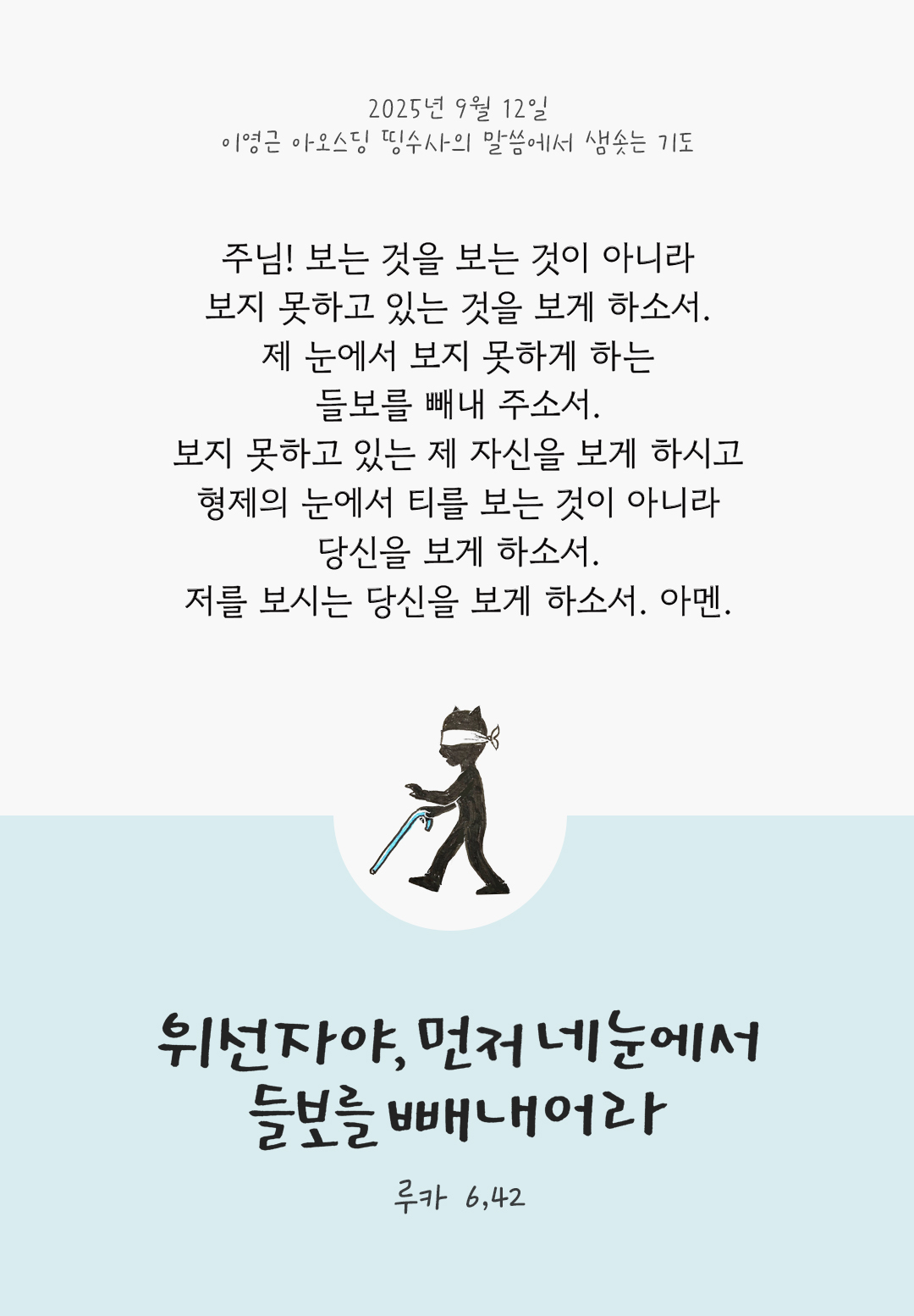 “눈먼 이가 눈먼 이를 인도할 수야 없지 않으냐? 둘 다 구덩이에 빠지지 않겠느냐? 제자는 스승보다 높지 않다. 그러나 누구든지 다 배우고 나면 스승처럼 될 것이다. 너는 어찌하여 형제의 눈 속에 있는 티는 보면서, 네 눈 속에 있는 들보는 깨닫지 못하느냐? 네 눈 속에 있는 들보는 보지 못하면서, 어떻게 형제에게 ‘아우야! 가만, 네 눈 속에 있는 티를 빼내 주겠다.’ 하고 말할 수 있느냐? 위선자야, 먼저 네 눈에서 들보를 빼내어라. 그래야 네가 형제의 눈에 있는 티를 뚜렷이 보고 빼낼 수 있을 것이다.” (루카 6,39-42)