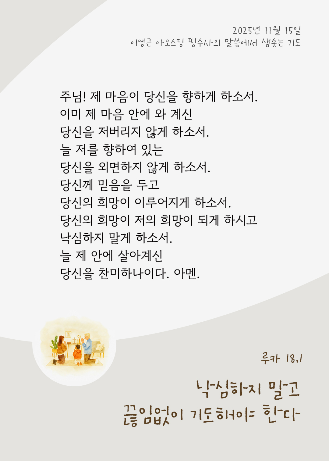 하루를 시작하며 말씀 이미지를 통해 말씀을 기억하고 마음을 새롭게 하도록 이끌어주심에 감사합니다. 오늘 말씀카드 성경구절은 루카복음 18장 1절 입니다.