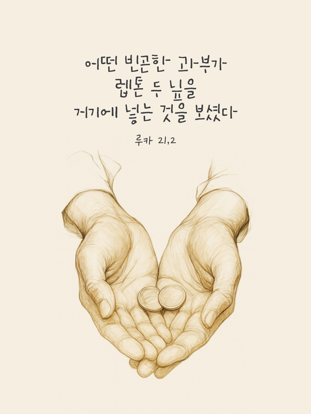 하루를 시작하며 말씀 이미지를 통해 말씀을 기억하고 마음을 새롭게 하도록 이끌어주심에 감사합니다. 오늘 말씀카드 성경구절은 루카복음 21장 2절 입니다.