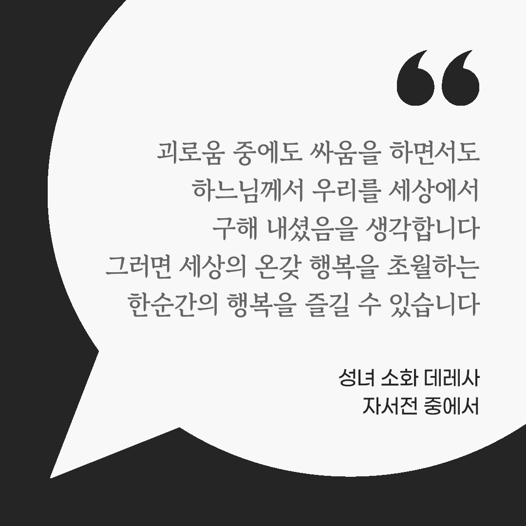괴로움 중에도 싸움을 하면서도 하느님께서 우리를 세상에서 구해 내셨음을 생각합니다. 그러면 세상의 온갖 행복을 초월하는 한순간의 행복을 즐길 수 있습니다. (성녀 소화 데레사 자서전 중에서)