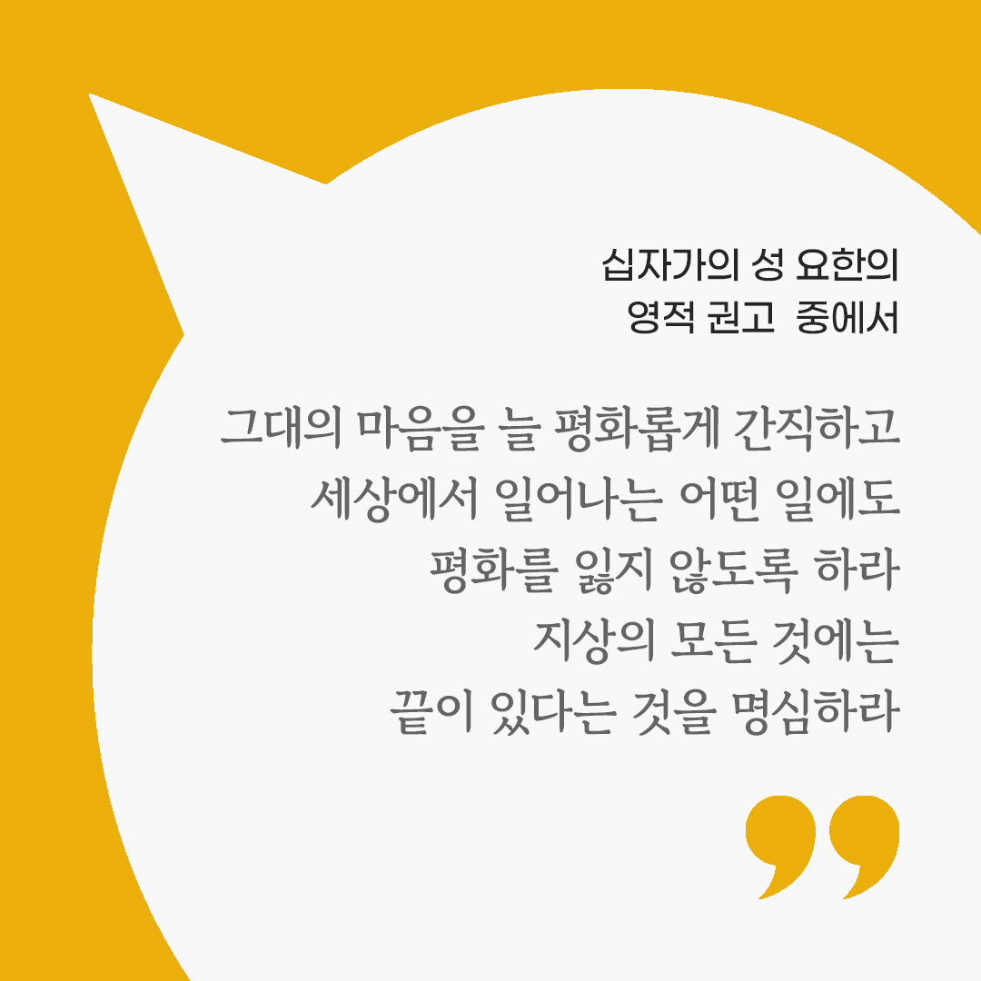 그대의 마음을 늘 평화롭게 간직하고 세상에서 일어나는 어떤 일에도 평화를 잃지 않도록 하라.지상의 모든 것에는 끝이 있다는 것을 명심하라. (십자가의 성 요한의 영적 권고 중에서)