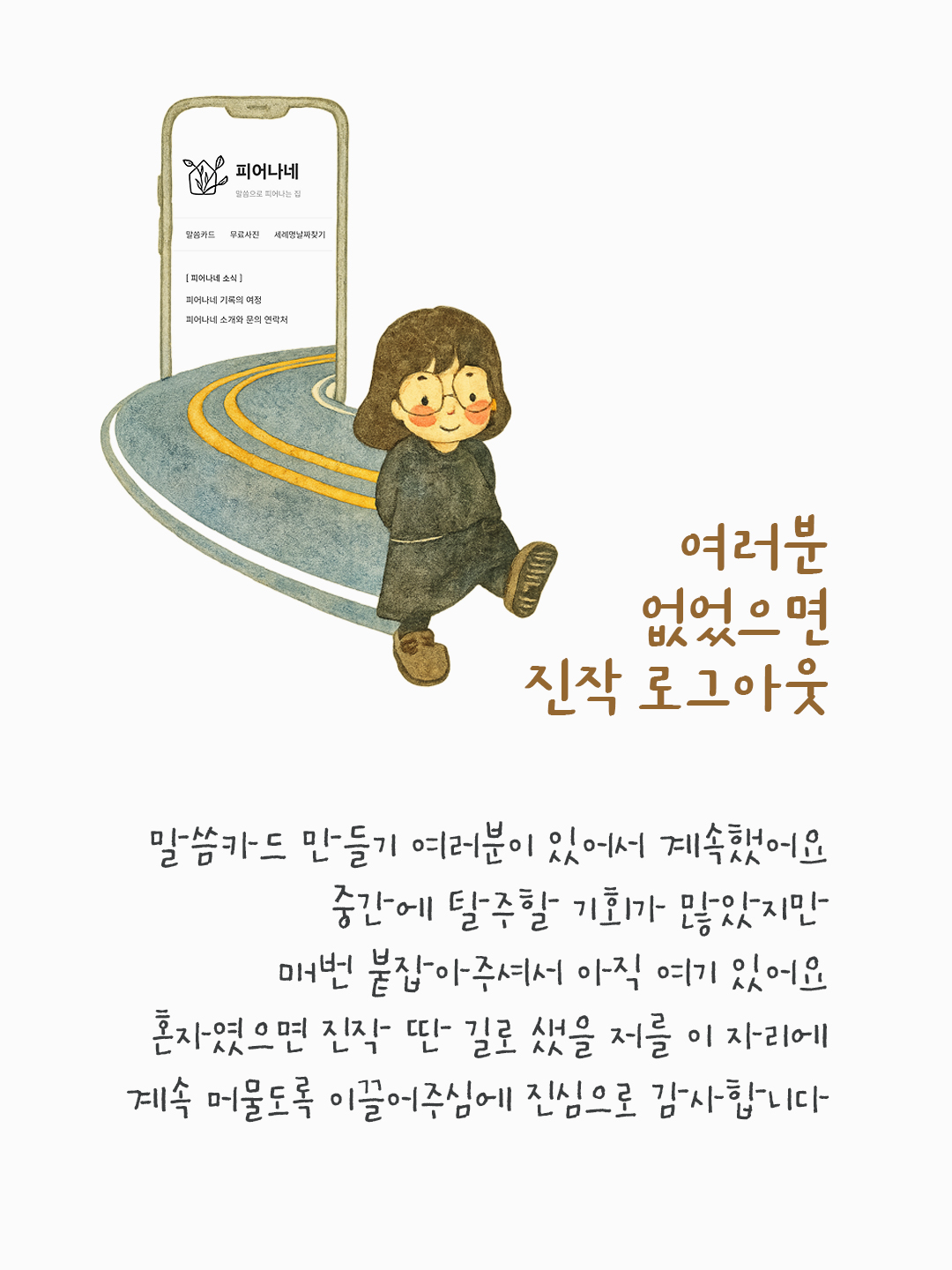 - 카카오톡에서 아이디 pieonane를 검색해 친구 추가 후 “말씀카드 받고 싶어요!”라고 메시지를 남겨주세요.