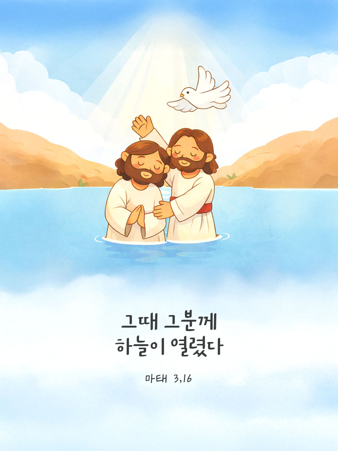 예수님께서는 죄 없으신 분이시지만 세례자 요한에게 세례를 받으십니다. 이는 겸손으로 하느님의 뜻에 온전히 순종하신 선택이었습니다. 그 순간 하늘에서는 “내가 사랑하는 아들”이라는 음성이 울려 퍼집니다. 우리도 세례를 통해 하느님의 자녀로 다시 태어났습니다. 물과 성유, 흰옷으로 새 생명을 입은 그날의 첫 마음을 기억합시다. 지금도 주님께서는 우리에게 같은 사랑의 말씀을 건네십니다.