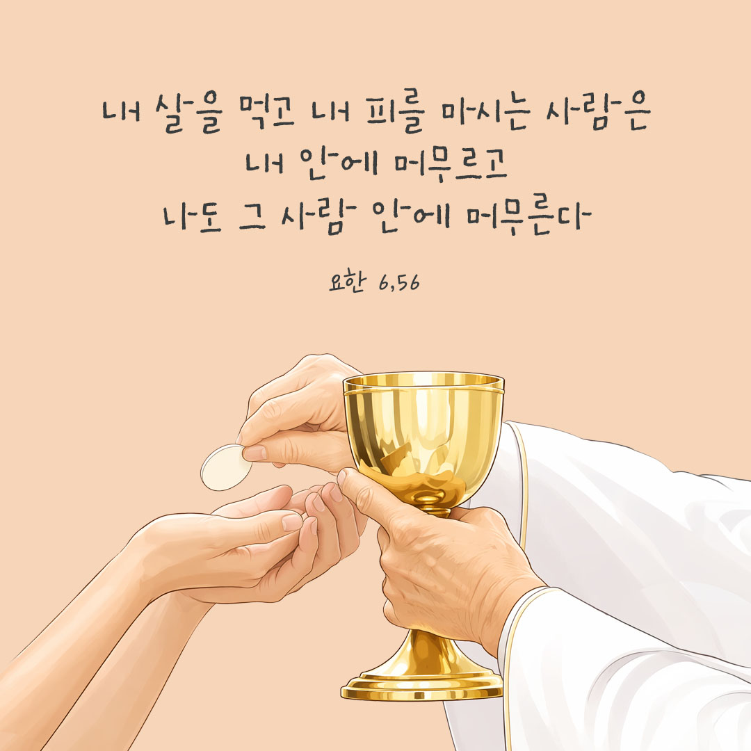 “내 살을 먹고 내 피를 마시는 사람은 내 안에 머무르고 나도 그 사람 안에 머무른다.”(요한 6,56)