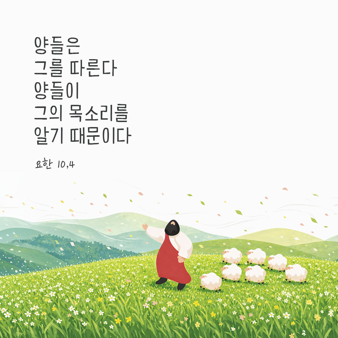 우리는 과연 누구의 목소리를 듣고 따릅니까? 두려움과 불안을 조장하는 세상의 목소리가 아닌, 내 이름을 다정히 부르며 평화로 이끄시는 착한 목자이신 주님의 목소리를 듣고 따라야 합니다. 그래야 그분 안에서 참된 안식과 기쁨을 누릴 수 있습니다.