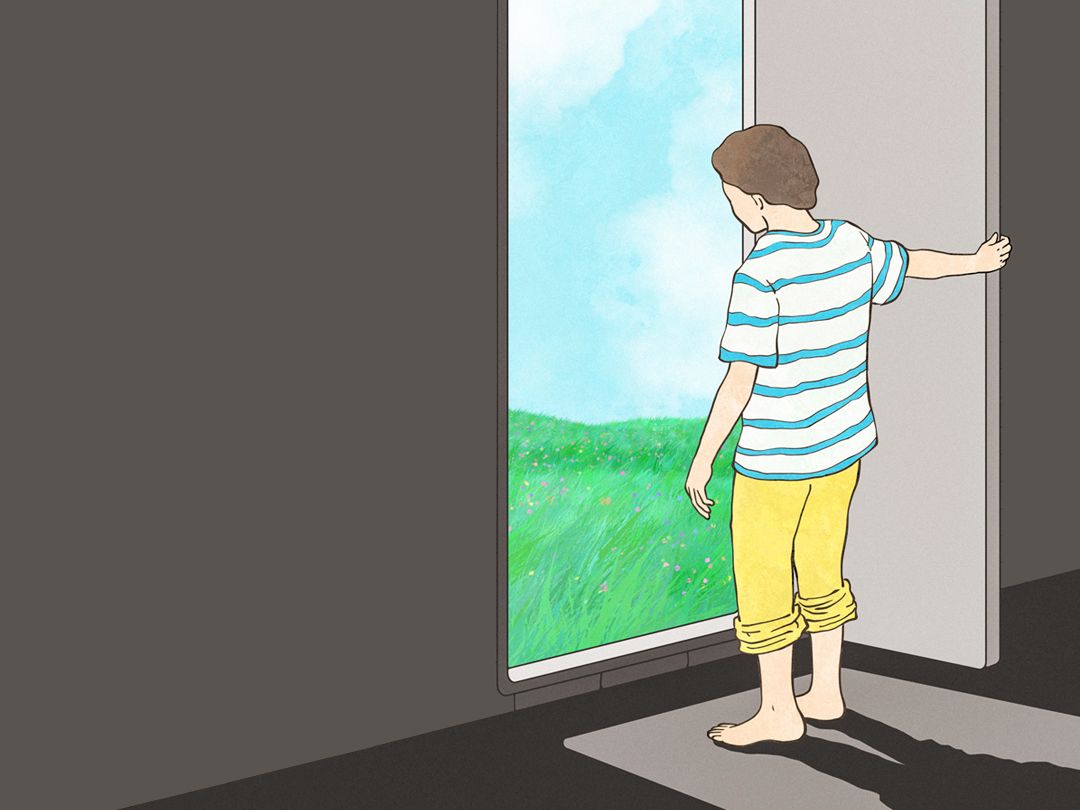 문을 열고 풀밭으로 나가는 사람